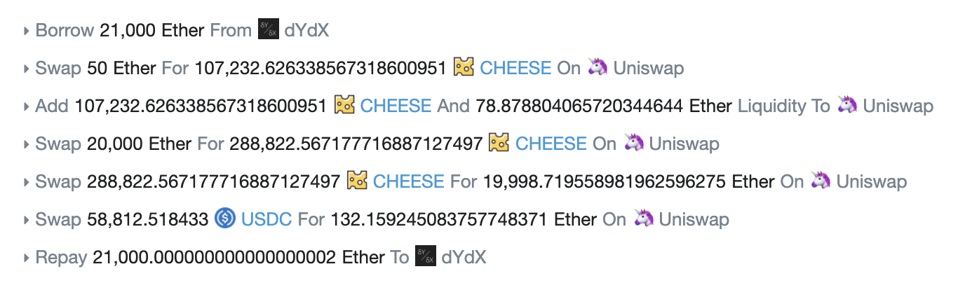 - Swap 288k CHEESE back to 19.98k ETH on Uniswap.