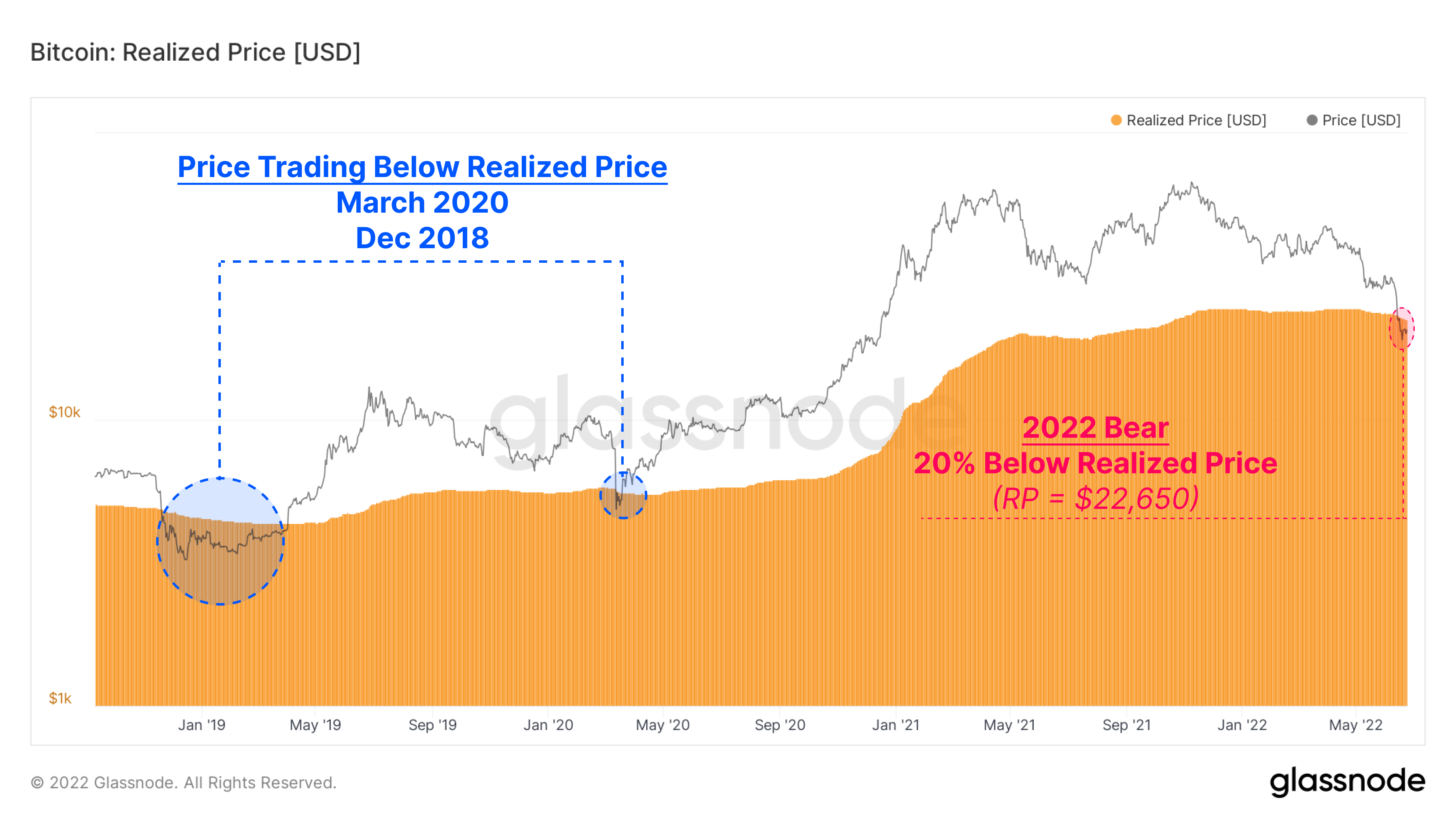 - Bitcoin spot prices are trading well below the Realized Price, indicating the average market investor is underwater on their holdings.