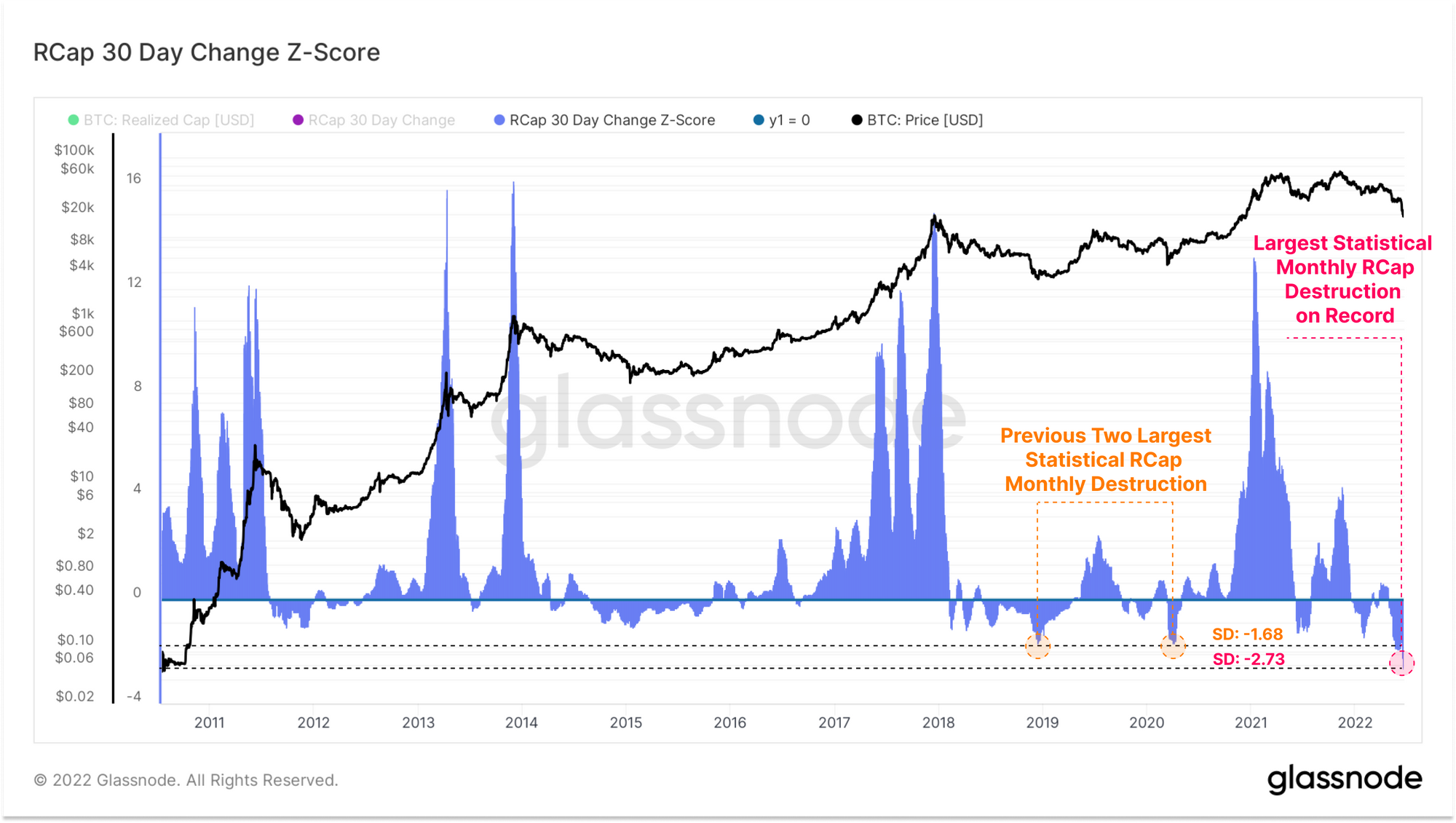 - The market has seen the largest monthly decline of the Realized Cap in history on a statistical basis.