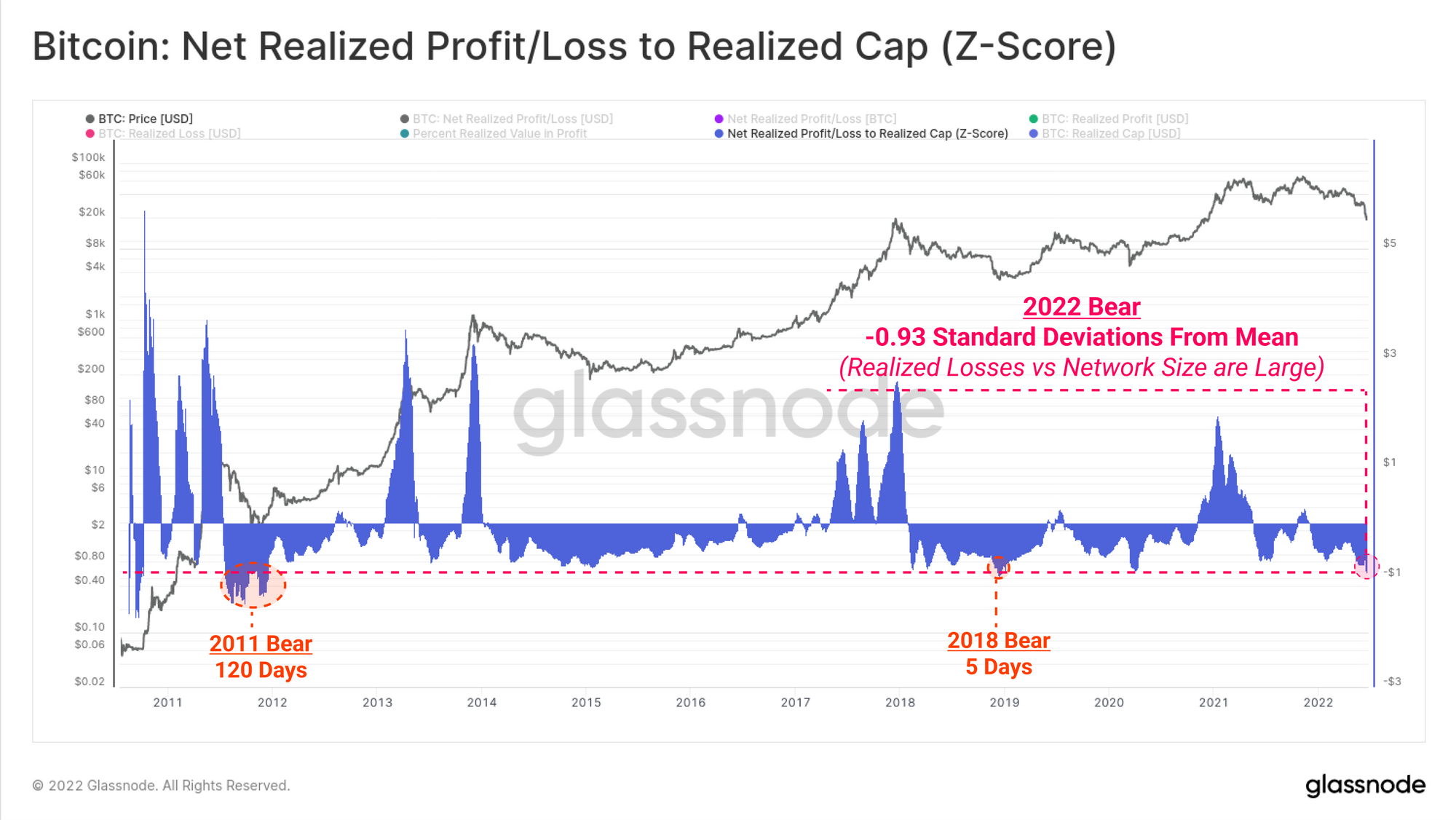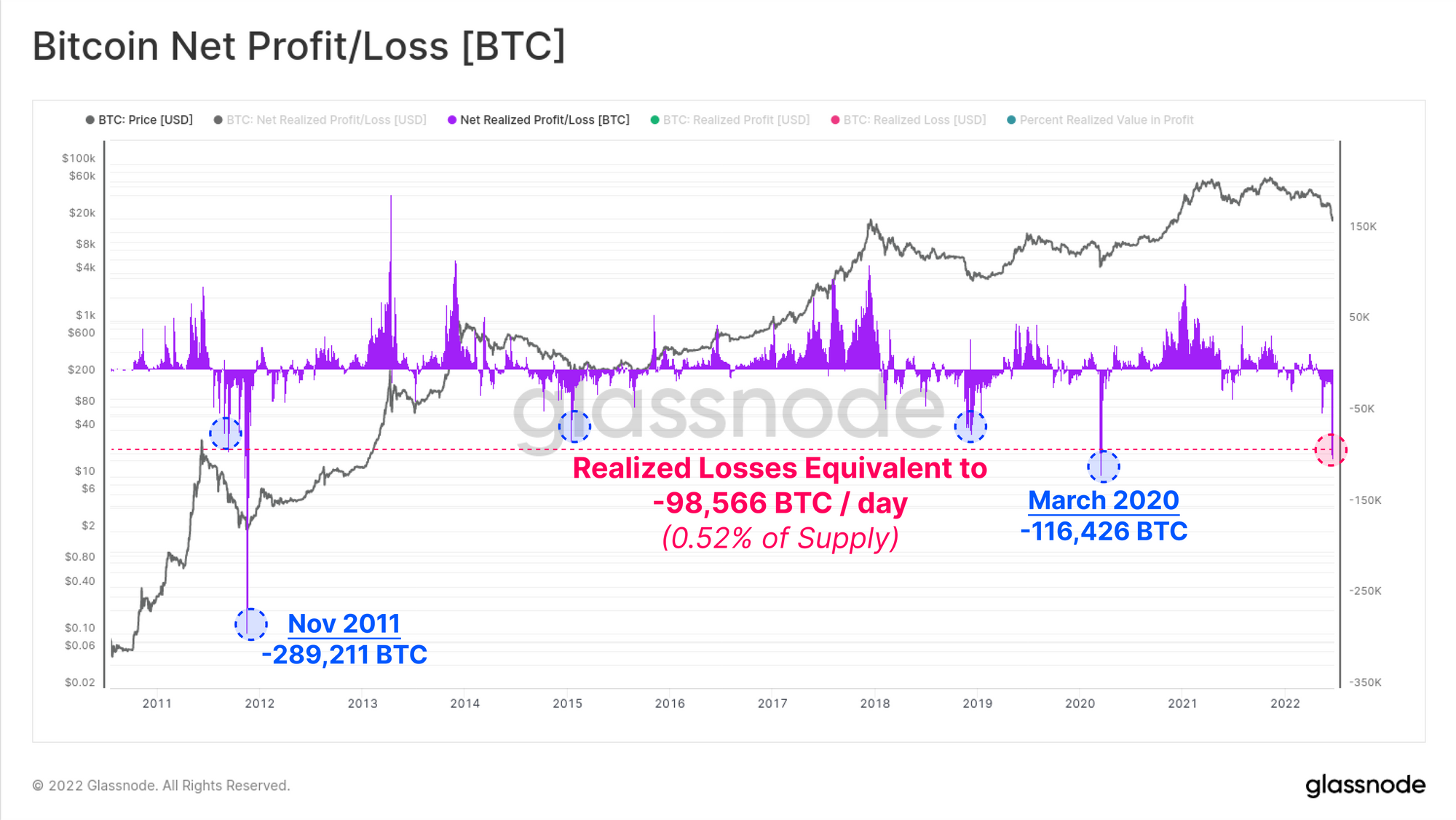 Gauging Net Realized Profit/Loss in units of BTC, which effectively normalizes for market size, the current drawdown is recording Realized Losses equivalent to -98,566 BTC per day (0.52% of the circulating supply). There have been only two recorded trading days with larger recorded Realized Losses, found in the 2011 bear market, and on March 2020.