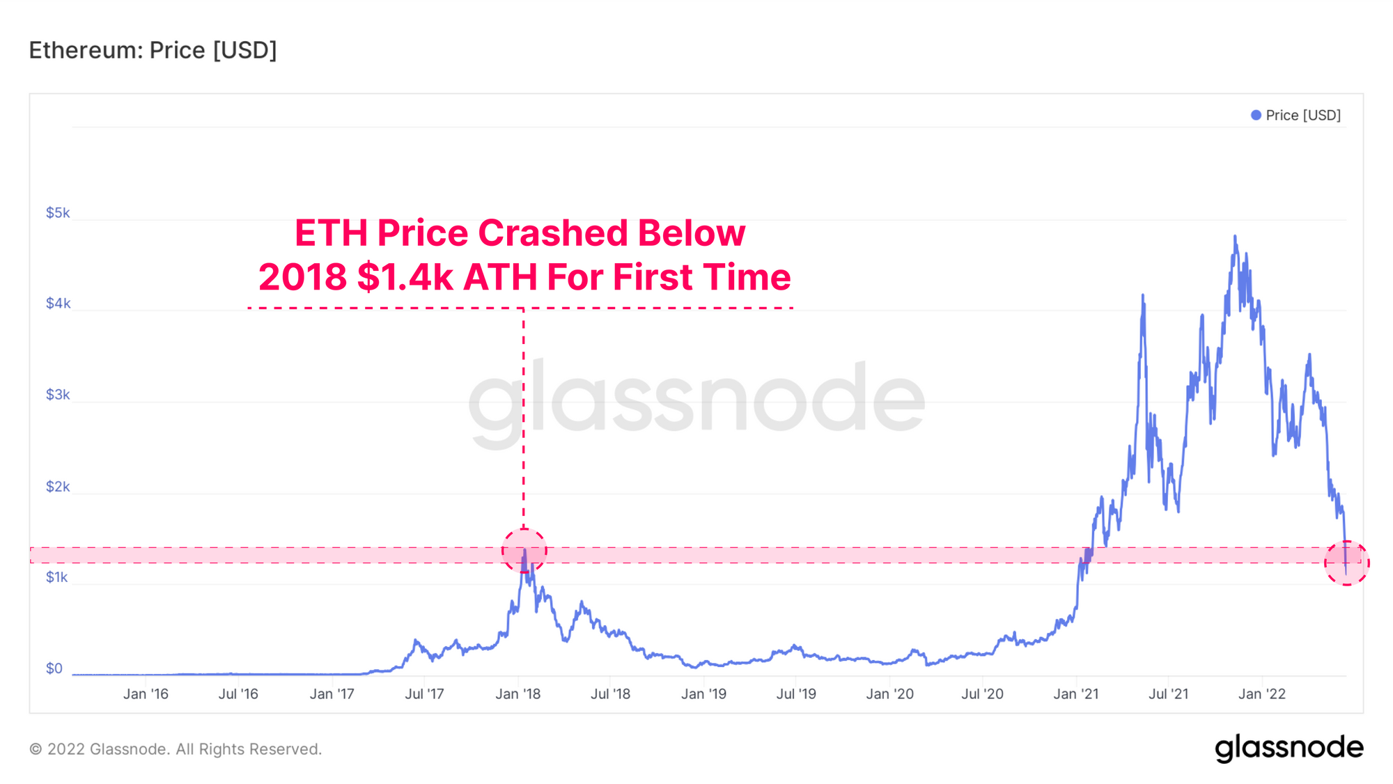 The price of the second largest digital asset, Ether (ETH) is hardly unscathed, having also retraced below the 2018 cycle ATH of $1.4k. With both the major digital assets trading below lasy cycles ATH, we can swiftly dispel any tropes about ATHs providing an ‘impenetrable’ support level.