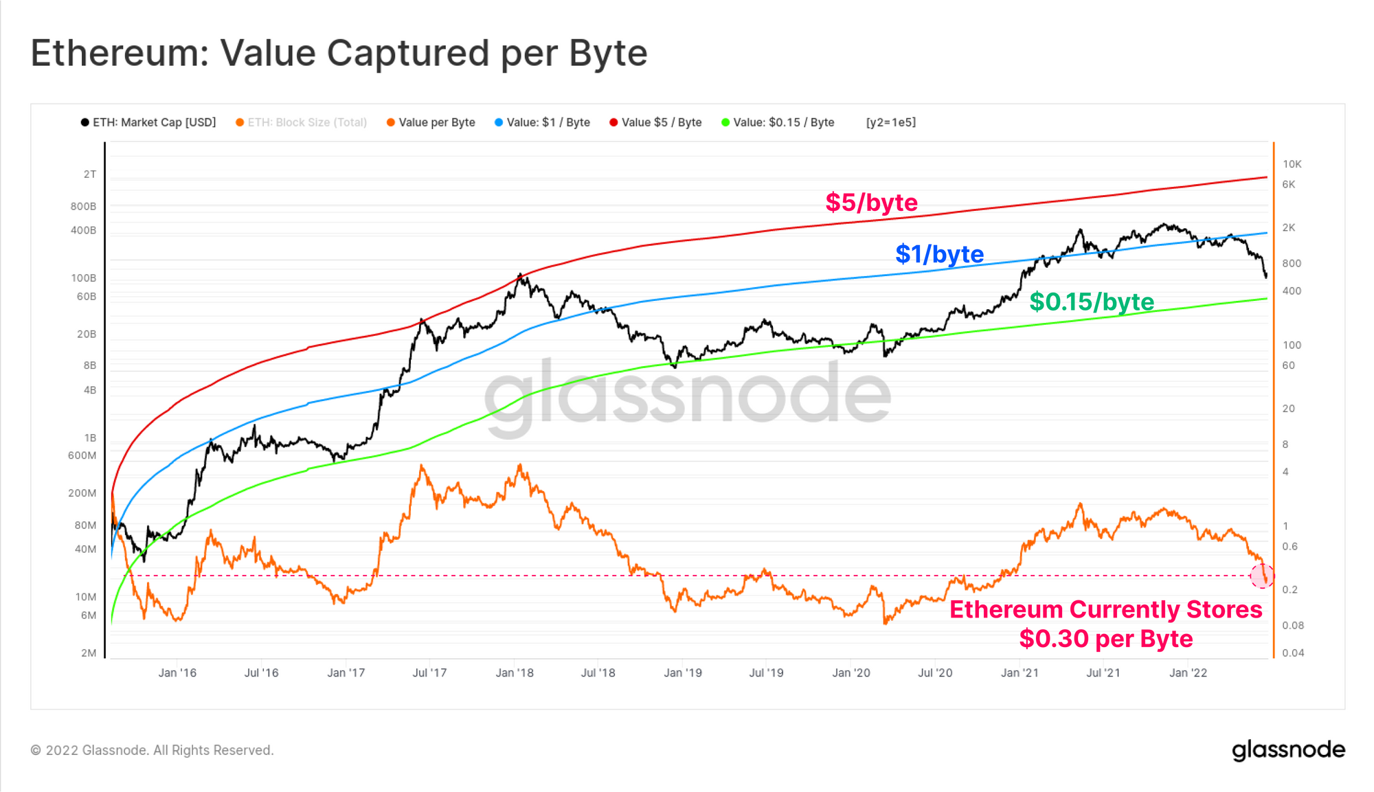 An interesting metric that was first proposed by Permabull Nino describes the value captured by Ethereum per blockchain byte. As the leading smart contract platform, and hosting a vibrant application ecosystem, it follows that the value captured per byte of data stored should theoretically increase with improving network effects (and vice-versa).