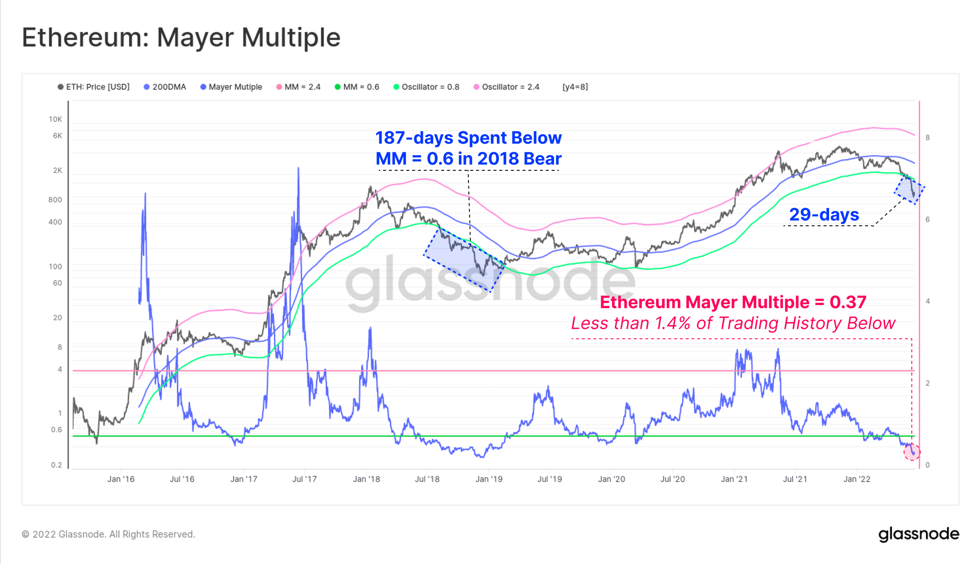 The Mayer Multiple band of 0.6 represents a level of downside deviation with approximately 10% of all ETH trading days being below it. In the 2018 bear market, ETH spent 187-days below this band during the worst of the price action. In the current market, ETH has traded below this band since early June, and has now been below it for 29-days.