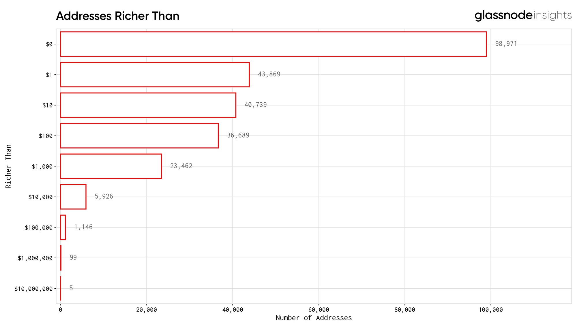 First, we looked at the number of addresses richer than a certain value. The thresholds are in USD and we used a price of $3.02 (approximate LINK price on July 14th according to CoinMarketCap) to compute USD balances.