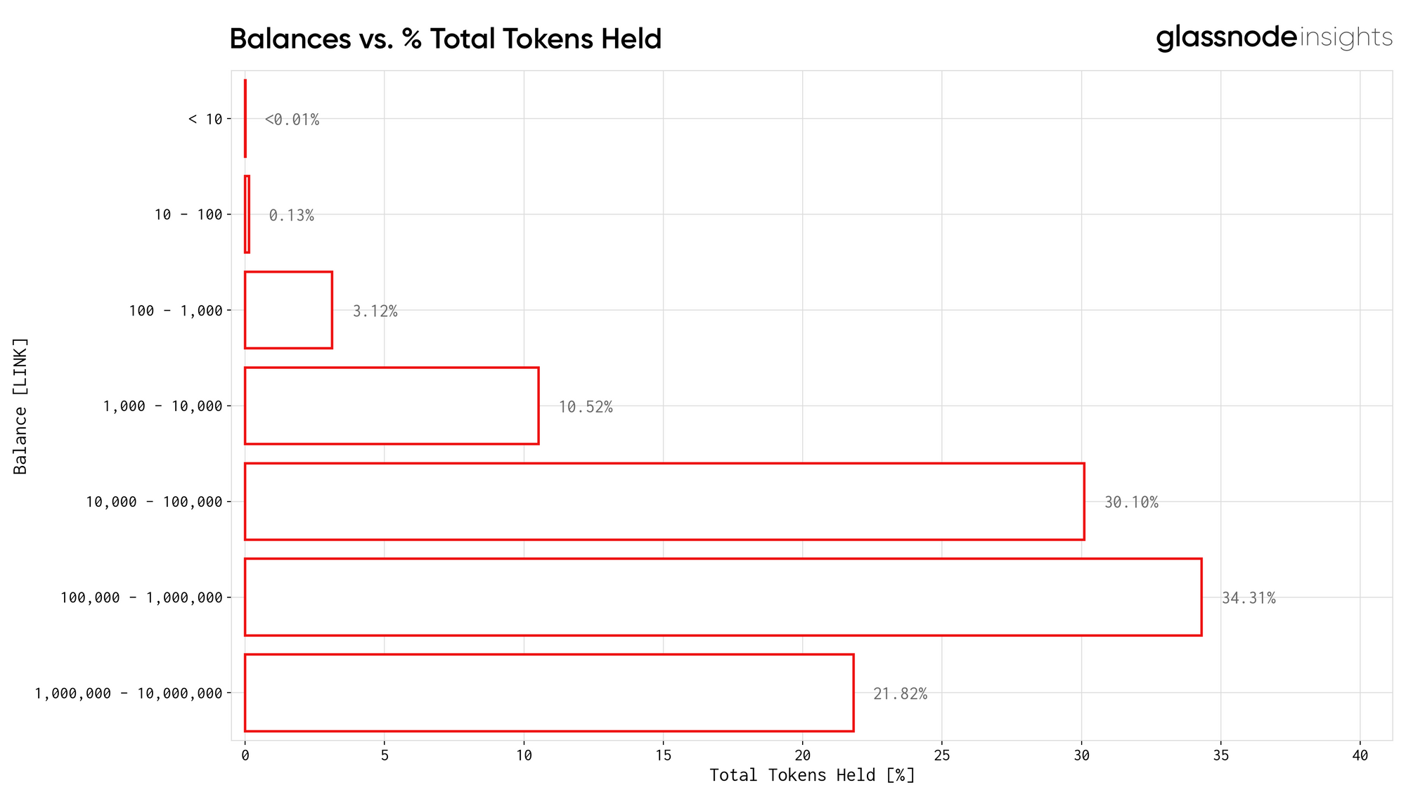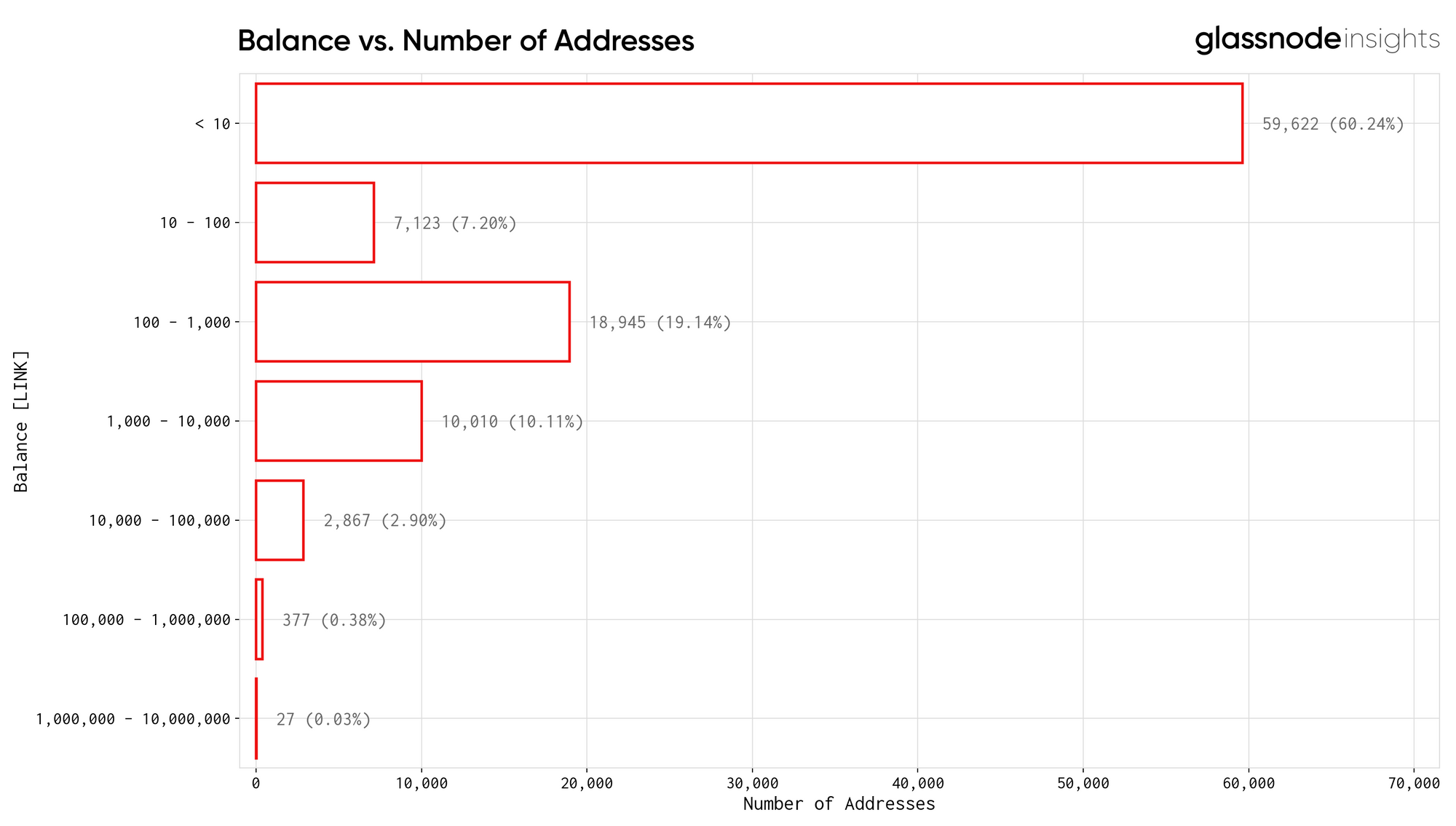 Next, we analysed the number of addresses within certain balance ranges. As shown in the graph below, the vast majority of addresses holding LINK (60.24%) hold under 10 tokens.