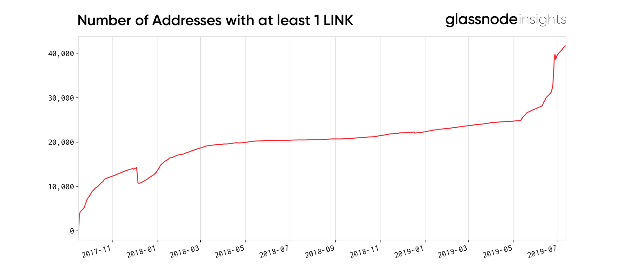 The below graph shows the number of addresses with at least 1 LINK over time.