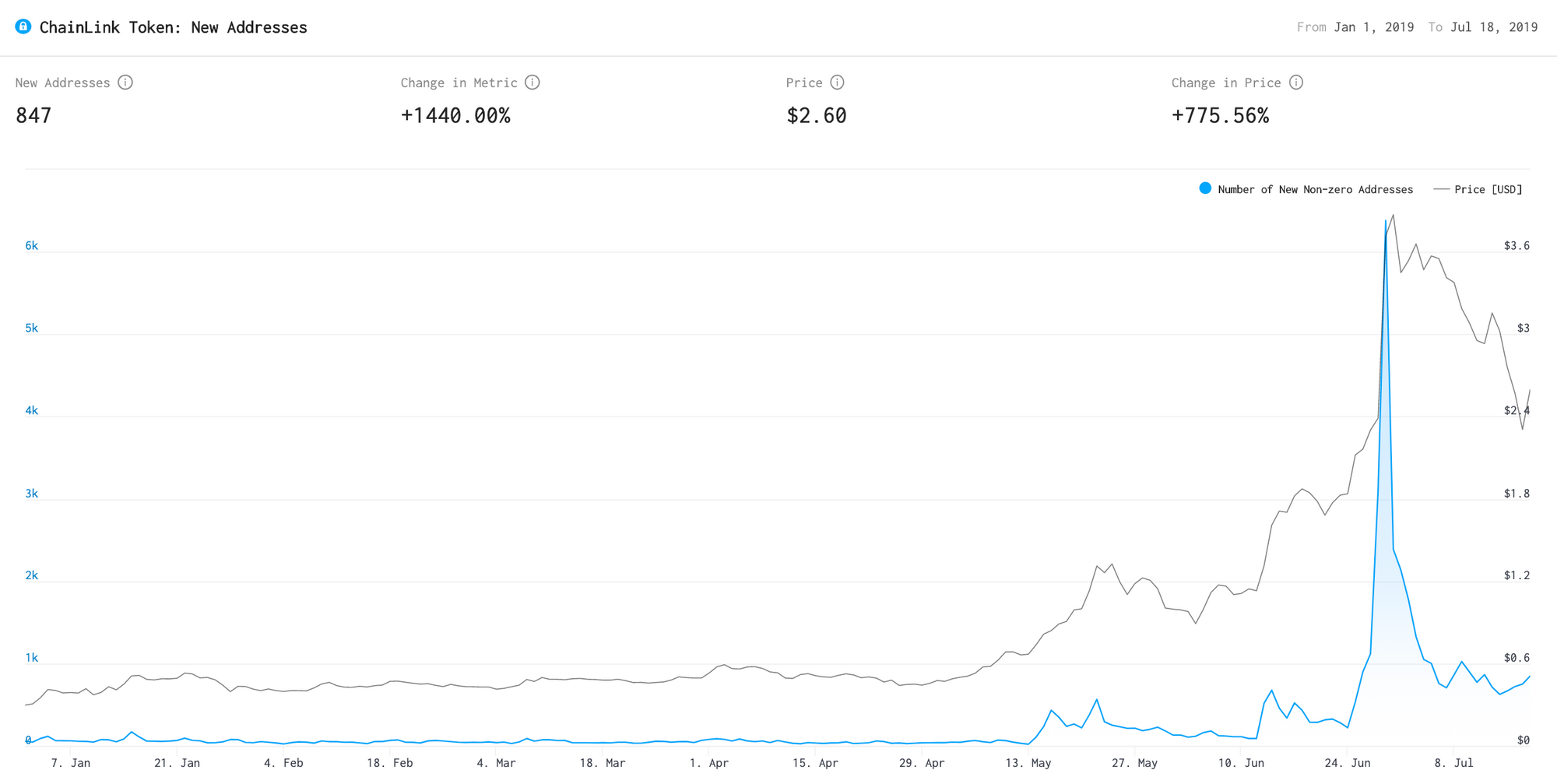 Similarly to the previous graph, the horizontal trend was broken in mid May. The lowest bucket increased considerably and kept that growth as time went on, indicating adoption of the Chainlink network by new players. This is further supported by the recent significant increase in newly created addresses. Even if we discount the large spike (likely due to Coinbase's deposit procedure), the number of daily new addresses has been increasing significantly since May,