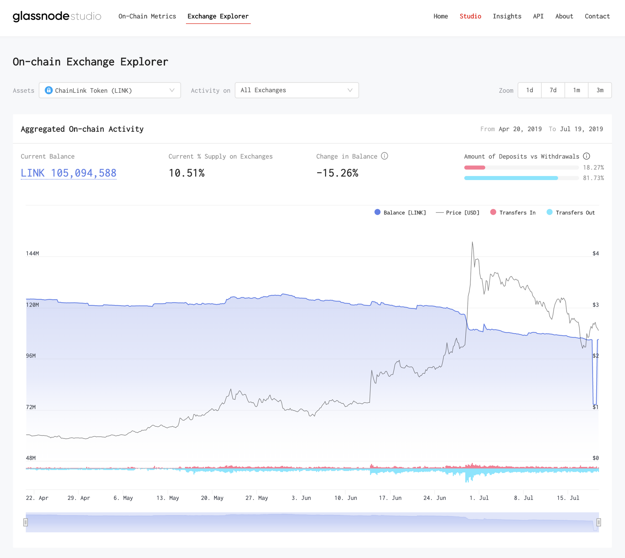 Exchange balances are based on Glassnode’s internal address flags database. We’ve built an interactive tool that monitors on-chain activity of ETH and ERC20 on exchanges over time. Visit the Glassnode Studio to explore LINK’s exchange activity.