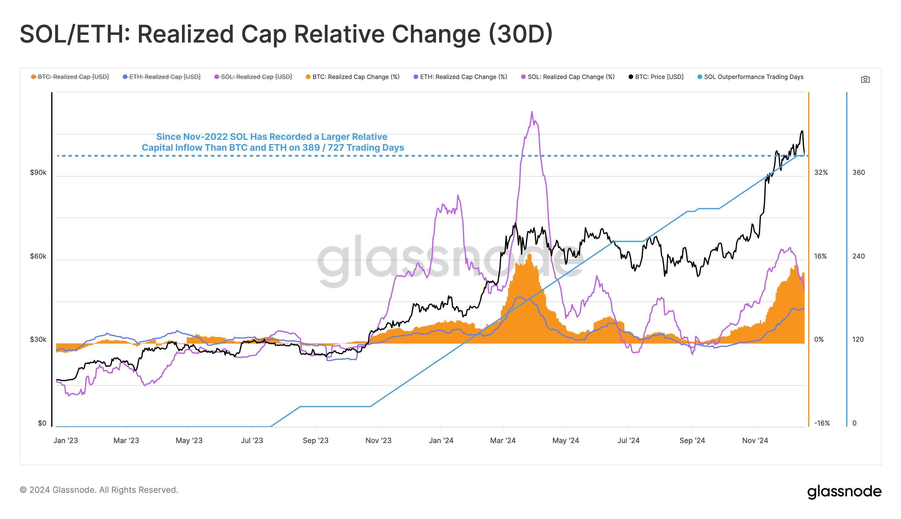 - Since the cycle low in Nov 2022, Solana has outperformed Bitcoin and Ethereum when measured from the lens of price appreciation and relative capital inflows.