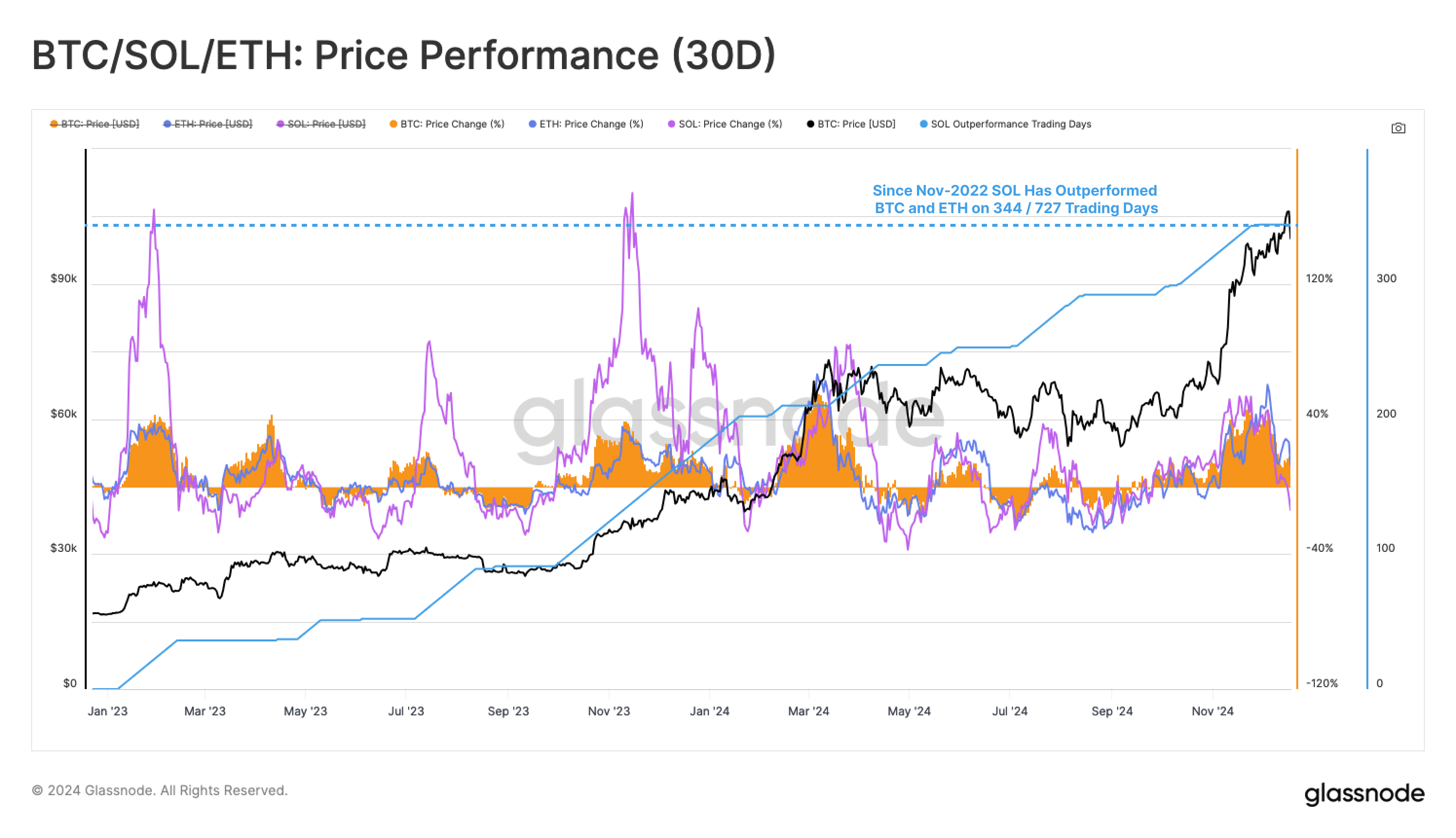 After plummeting to a shocking low of just $9.64, Solana has made a remarkable recovery, recording an astonishing increase of +2,143% over the last 2 years. This impressive price performance has allowed Solana to outperform both Bitcoin and Ethereum on 344 out of 727 trading days since the FTX event, showcasing the substantial growth and demand for the asset.