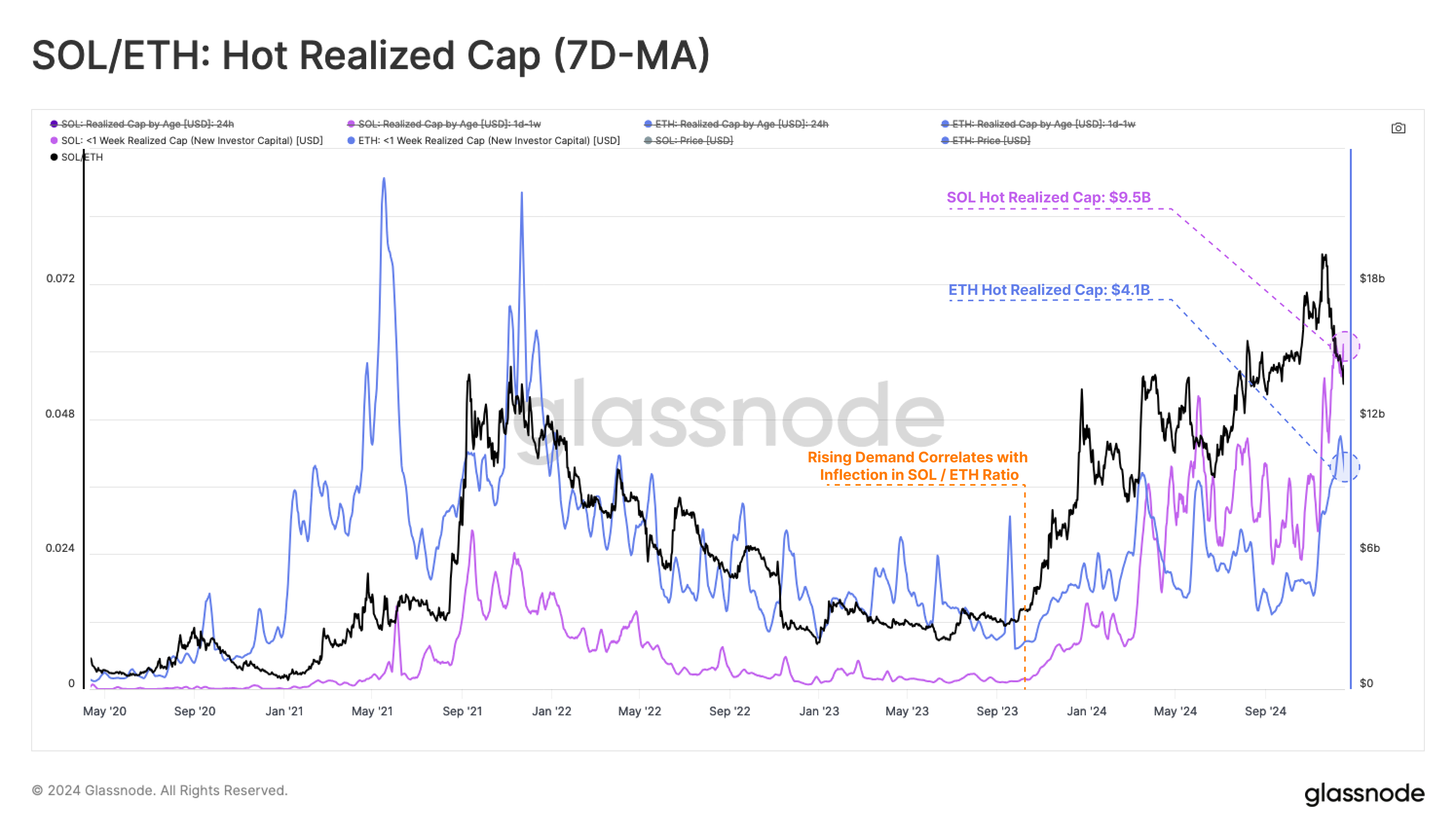 Notably, the stark uptick in Hot Realized Cap for Solana before the start of 2024 marked the upward inflexion point in the SOL / ETH ratio, with the influx of new capital driving growth.