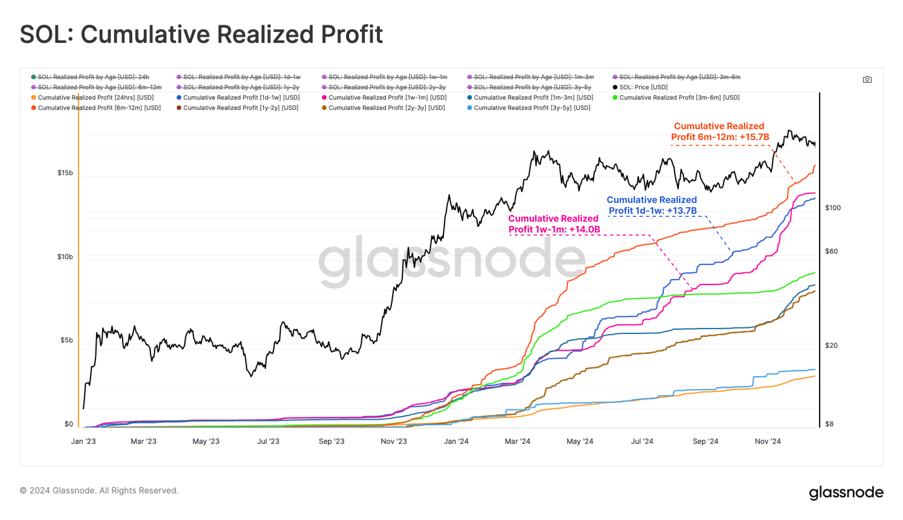 Notably, coins aged 1d-1w, 1w-1m, and 6m-12m are the significant contributors to sell-side pressure, each recording a comparable magnitude of profit. Together, they account for a substantial 51.6% of all profit realized, demonstrating a balanced distribution of market influence. This underscores the notion that Solana as an asset is seen as an investment opportunity for all denominations of investor profile.