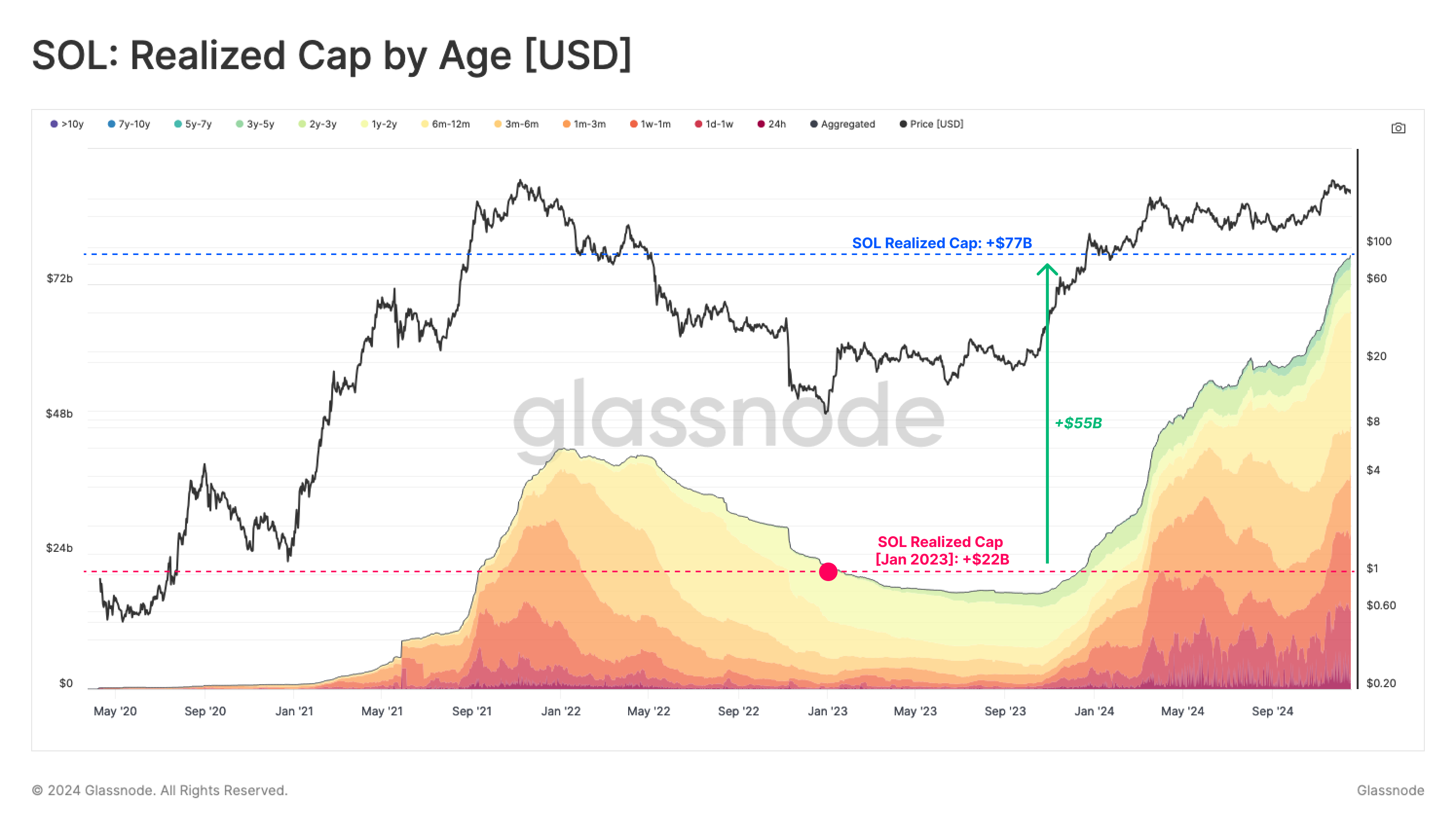 During the same time period, the significant inflow of capital has allowed Solana to accrue over +$55B in USD liquidity, increasing the Realized Cap from $22B to an astonishing $77B.