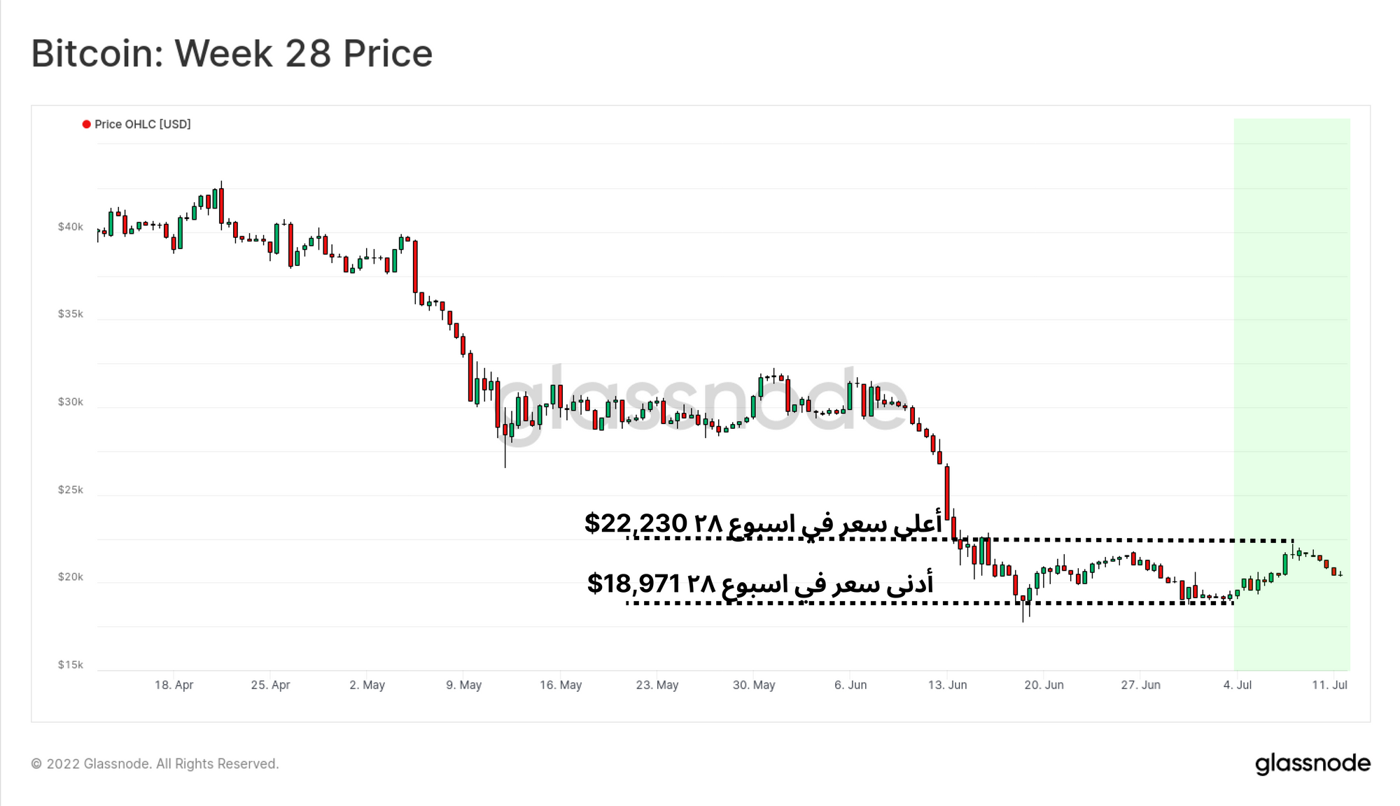 تستمر أسعار البيتكوين في التماسك حول نطاق 20$ ألف دولار هذا الأسبوع، في حين يقوم السوق باستيعاب التقلب الشديد و الهابط في شهر يونيو. تم تداول الأسعار على ارتفاع ، حيث افتتح السعر عند أدنى مستوى أسبوعي قدره 18,971$ دولارًا وبلغ ذروته عند 22,230$ دولارًا.