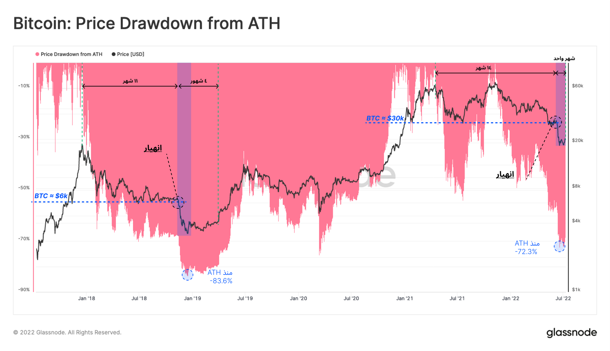 يشمل السوق الهابط السائد حالياً على العديد من أوجه التشابه مع أواخر عام 2018 من حيث ظروف السوق، وهو ما يمكننا رؤيته في السحب من مقياس ATH. فيما يلي مقارنة بين البير ماركت لسنة 2022 الحالية مع البير ماركت لسنة 2018: