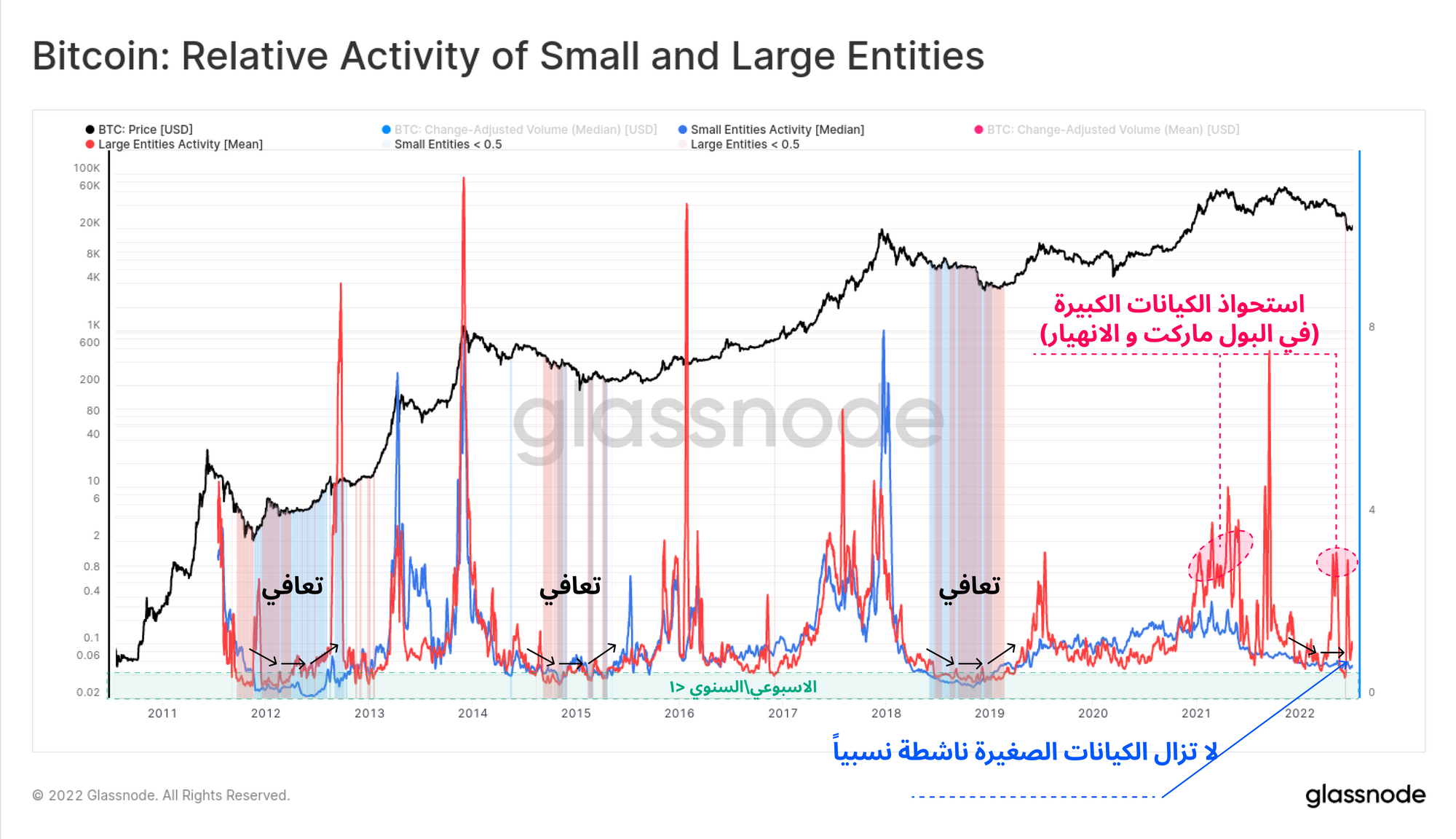 وضع السوق حاليا يحتوي على العديد من مؤشرات مرحلة متأخرة من البير ماركت. حيث يواجه المعدنين والمستثمرين الطويلي الامد ضغطاً للبيع بهدف الوصول لمرحلة الاستسلام الاستثماري. حجم المعروض من البتكوين وصل لنسبة خسارة تقدر بنسبة 44.7% و مستثمرين طويلين الأمد هم من يتحملون النسبة الأكبر من الخسارة. ولكن مازالت هذه النسبة أقل من نسب الخسارة التي حدثت في فترات البير ماركت الماضية. ونحن قدمنا مؤشر جديد يتابع نشاطات الكيانات الصغيرة والكبيرة كأداة مساعدة لمعرفة وضع تعافي السوق وهذا يدعم الحقيقة التالية: بأن وضع السوق حالياً لا يزال قابل للهبوط ولم يشكل قاع واضح حتى الان. في المجمل هناك بصمة لعملية إستسلام على نطاق واسع من السوق ولكن هناك مزيد من الألم قادم مع مرور الوقت ومزيد من المخاطر التي ستختبر عزم المستثمرين وتمكين السعر من تشكيل قاع.