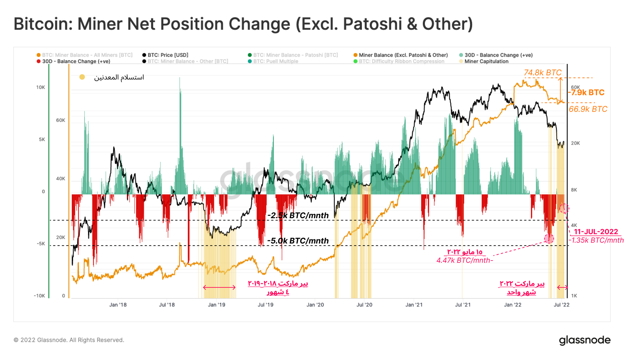 مع التأكد من خطر إستسلام المعدنين وأخذه بعين الإعتبار يمكننا أن نؤكد بأن أرصدة المعدنين شهدت توزيعا يصل 4,470 ألف بتكوين في الشهر وهذا بدأ بشكل قوي بعد إنهيار عملية LUNA-UST . نتيجة للضغط على دخل المعدنين أدى ذلك لعملية توزيع (بيع ) إجمالي عدد 7,900 ألف بتكوين من خزاناتهم على مدى شهرين ولكن إنخفض هذا التوزيع ليصل لعدد 1,350 بتكوين في الشهر من خزاناتهم . مدة أستسلام المعدنين في بير ماركت 2018- 2019 كانت حوالي 4 شهور . وفي هذه الدورة مدة إستسلام المعدنين بدأت قبل شهر واحد فقط . يحتفظ المعدنين حاليا بعدد 66,900 ألف بتكوين في خزائنهم. إن لم تتعافى الأسعار بشكل ملموس سنكون أمام خطر مزيد من التوزيع " البيع " من قبل المعدنين في الربع القادم من السنة.