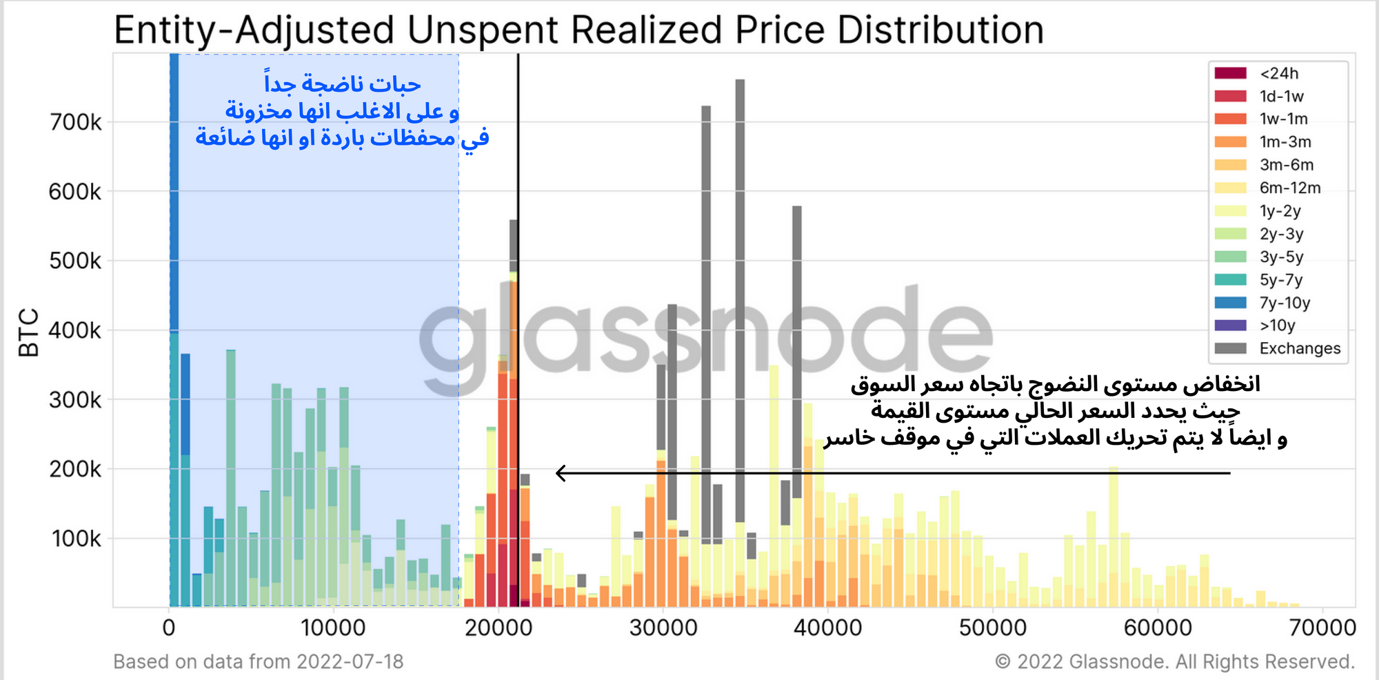 - يمكن أيضا رؤية انخفاض الطلب من القمة السعرية ( ATH) إلى القيمة السوقية الحالية ، مما يعكس مدة الاتجاه الهبوطي الحالي. كميات كبيرة من البيتكوين تراكمت منذ أكثر من 6 أشهر ، والتي تحمل قيمة خاسرة غير محققة عن سعر الشراء ومع ذلك لا يبدو أنها معروضة للبيع.