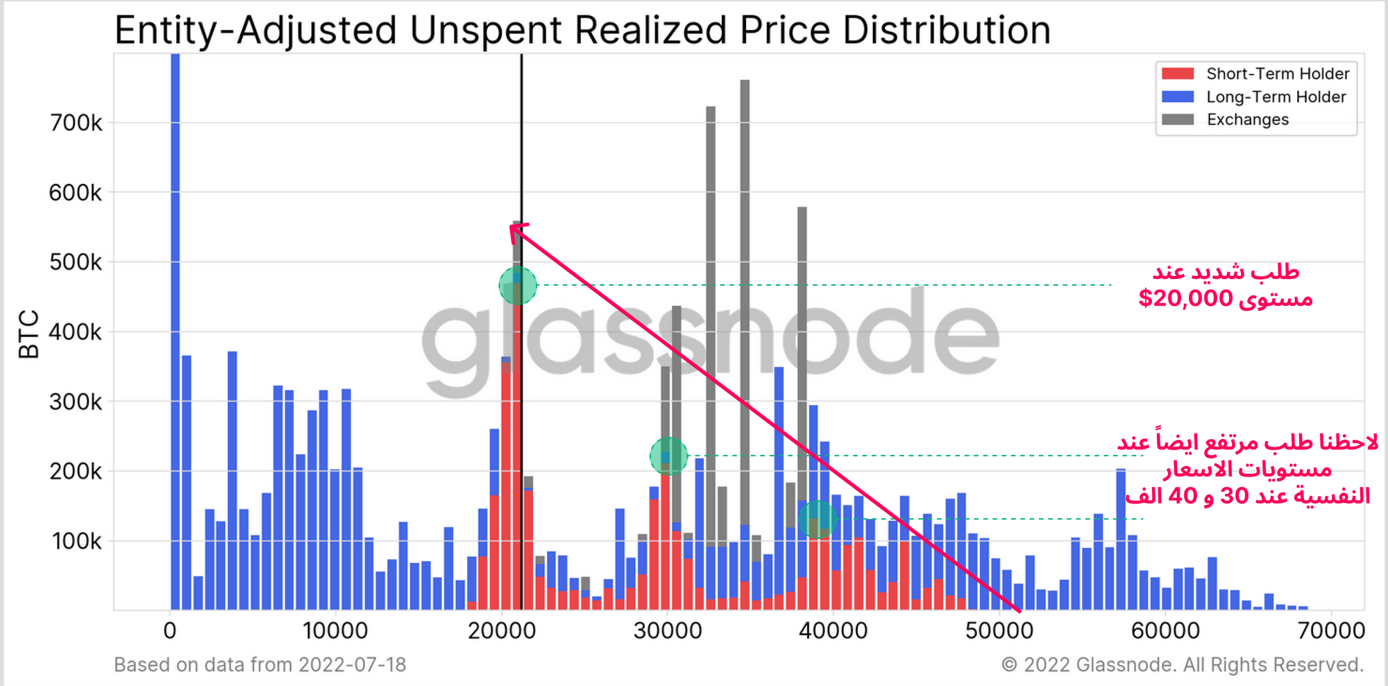 - يمكن ملاحظة ارتفاع الطلب حول منطقة الـ 20 ألف دولار مع كمية كبيرة من المعاملات التي حدثت في هذه المنطقة. تحتوي هذه المنطقة أيضًا على ثاني ورابع أكبر عقد توزيع السعر المحقق الغير مستهلك (URPD ): (حوالي 900 ألف BTC) مما يشير أيضًا إلى وجود نقل كبير لملكية البيتكوين داخل هذه المنطقة.