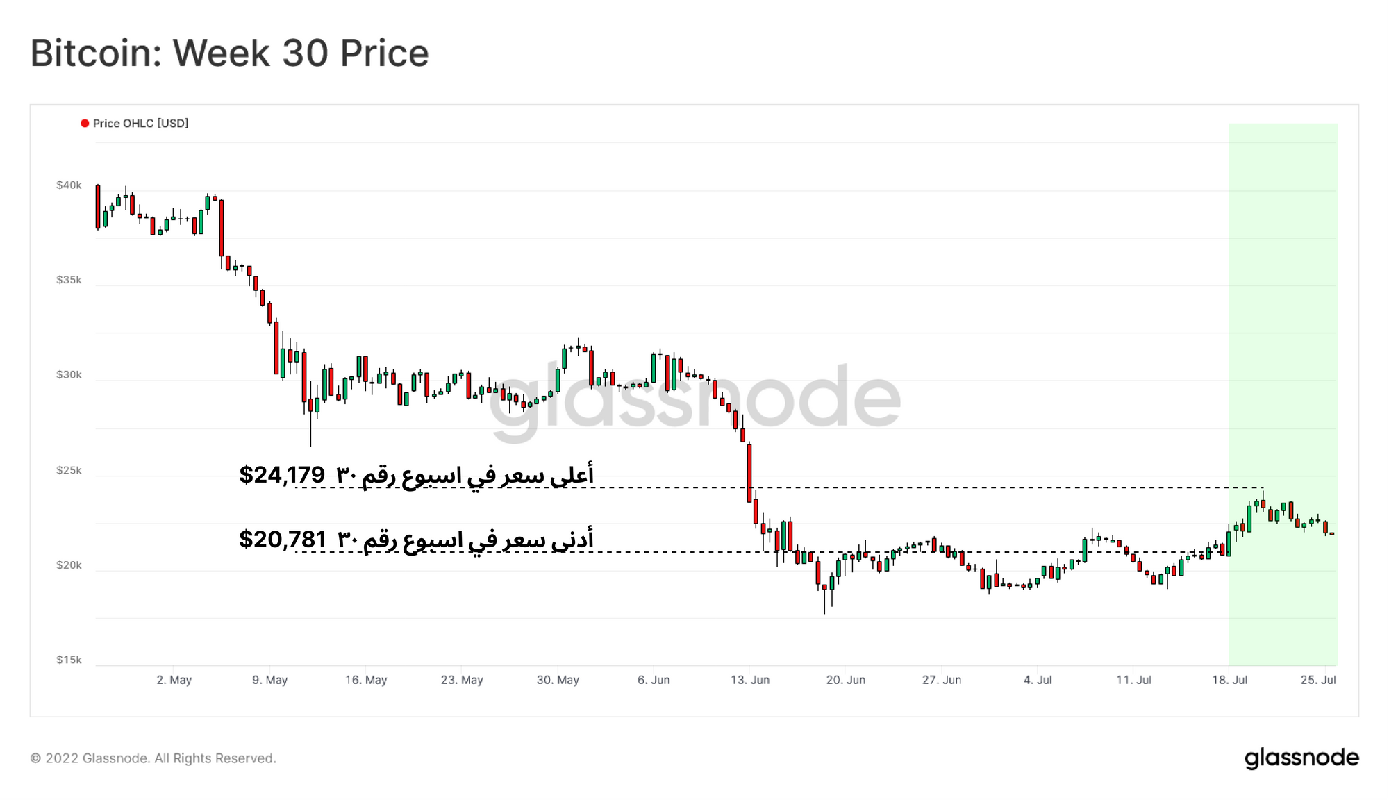 بعد انتهاء شهر من تماسك السعر، شهدت أسعار البيتكوين ارتفاعًا طال انتظاره حيث ارتفع السعر ليغلق الاسبوع بارتفاع 9% مقارنةً بسعر الافتتاح الاسبوعي. السعر فتح عند 20,781$ و ارتفع الى قمة 24,179$ قبل ان يرجع الى مستوى قمة منطقة التماسك السعري خلال عطلة نهاية الاسبوع.