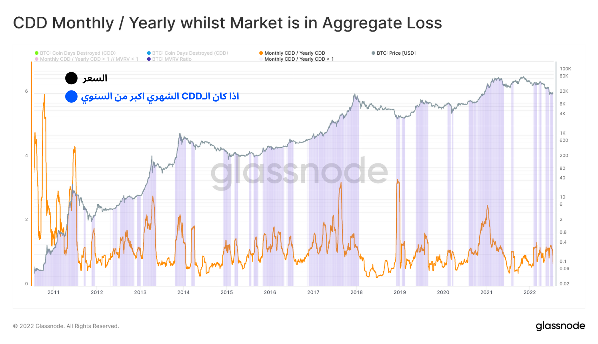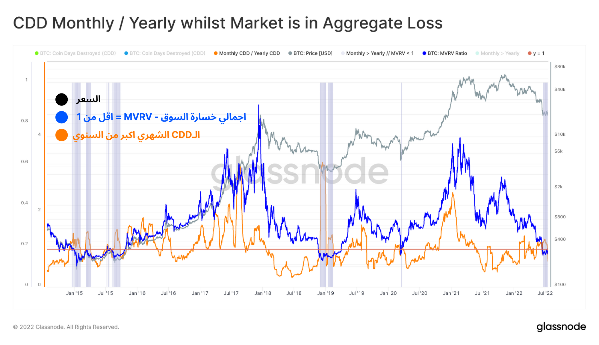 - ارتفاع مؤشر الـ CDD اعلى من الـ 1، توافقا مع هبوط مؤشر الـ MVRV اسفل الـ 1 : يتزامن مع السوق الهابط و مرحلة الاستسلام.