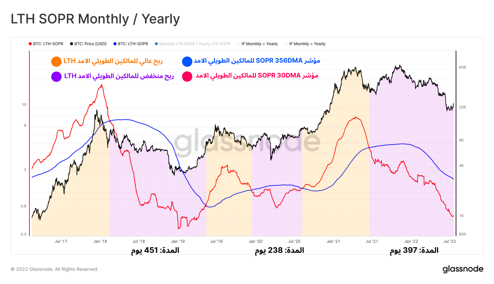- عندما تكون الربحية الشهرية أقل من الربحية السنوية (الحمراء)، فإنها تشير عمومًا إلى أننا فعليا في سوق هابط والخسائر محصورة من قبل مجموعة مالكين طويلي الأمد .