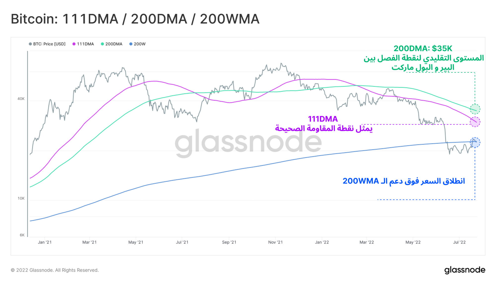 - 200WMA يبلغ حاليًا 22 ألف دولار وكان تاريخيًا مؤشرًا للتكوين القاع.