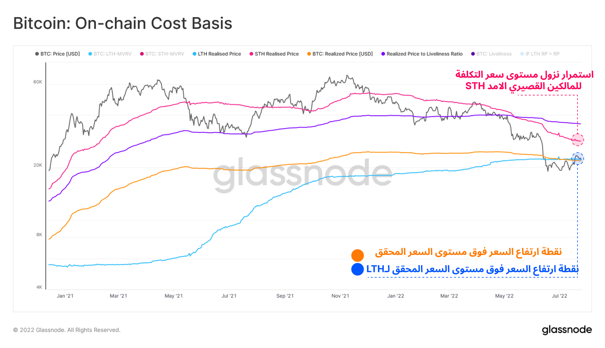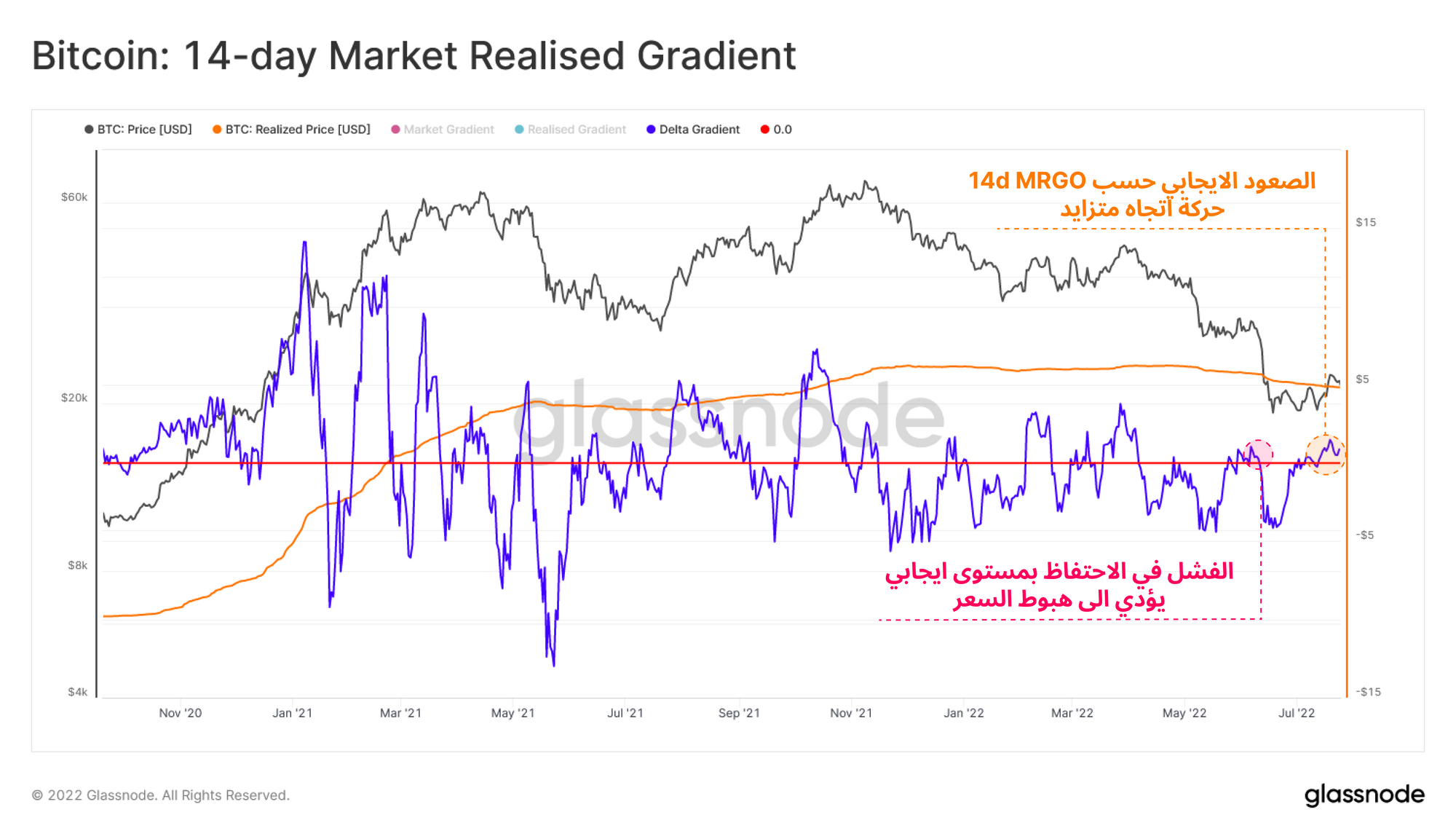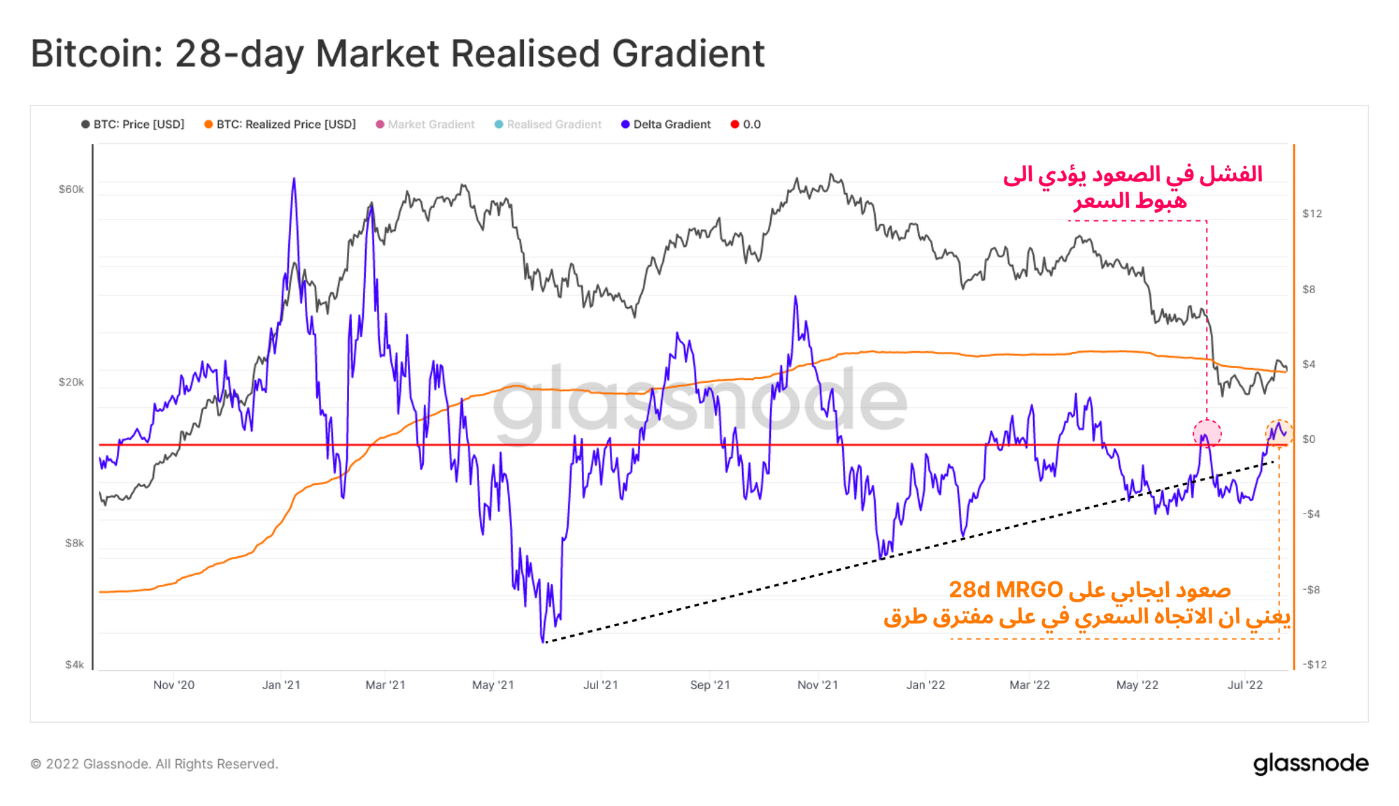 - سجل السعر اختراقًا أعلى من السعر المحقق، والسعر المحقق لمالكين مدى طويل (مستثمرين) ، والذي يتم تداول كل منهما بسعر 22 ألف دولار. القناة بين الاثنين هي نقطة اهتمام متنازع عليها توفر التقاء مع 200 WMA.