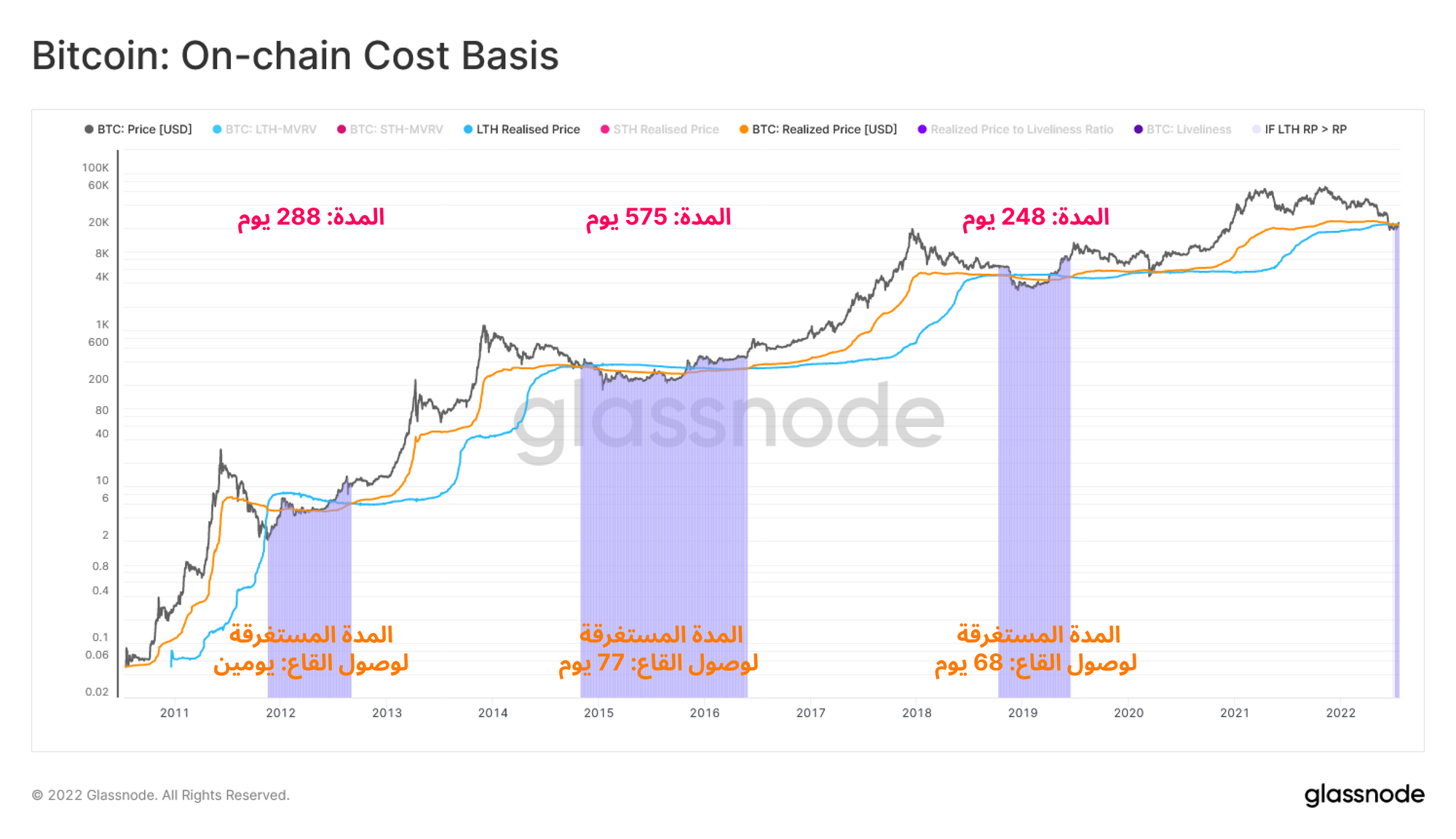 التفاعل المثير للإهتمام هو أنه يتم تداول أساس التكلفه السعرية للمتسمثرين طويلين الأمد فوق أساس التكلفة الإجمالية للسوق "السعر المحقق" . لكي يرتفع السعر المحقق للمتسثمر طويل الأمد عليه إما شراء عملات أعلي من سعر شرائه الأصلي أو تنضج العملات ذات التكلفة الأعلي إلي أكثر من 155 يوم وفي دورة السوق الهابط البير ماركت نادرا ما يحدث ذلك.