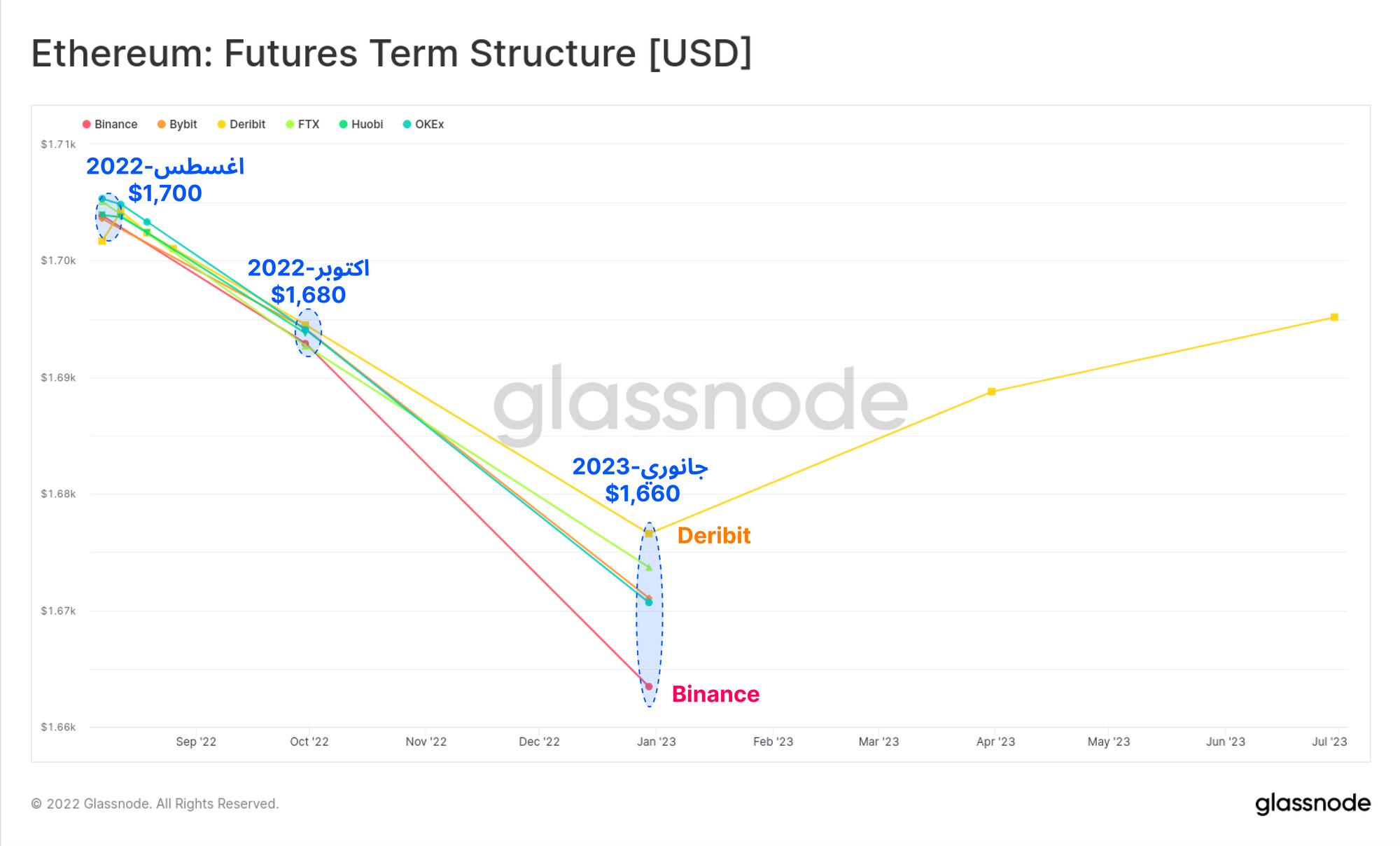يختلف هيكل وشكل العقود الآجله للإيثيريوم عن البتكوين بشكل ملحوظ . وشكله وهيكله حاليا في مرحلة تراجع وهذا يعني بأن تسعير الإيثيريوم أقل قبل الإندماج وبجانب معدل عالي من متداولين عقود الخيارات من قبل المتداولين . حينما الخصم على الإيثيريوم قليل فقط 2,27% وهذا يقترح بأن هناك نسبة عاليه من Short الرهان على نزول السعر في سوق المشتقات للإيثيريوم. وأكثر تفسير محتمل لذلك هو أن متداولين الإيثيريوم يستخدمون المشتقات كوسيلة تحوط لهبوط السعر بعد الإندماج.