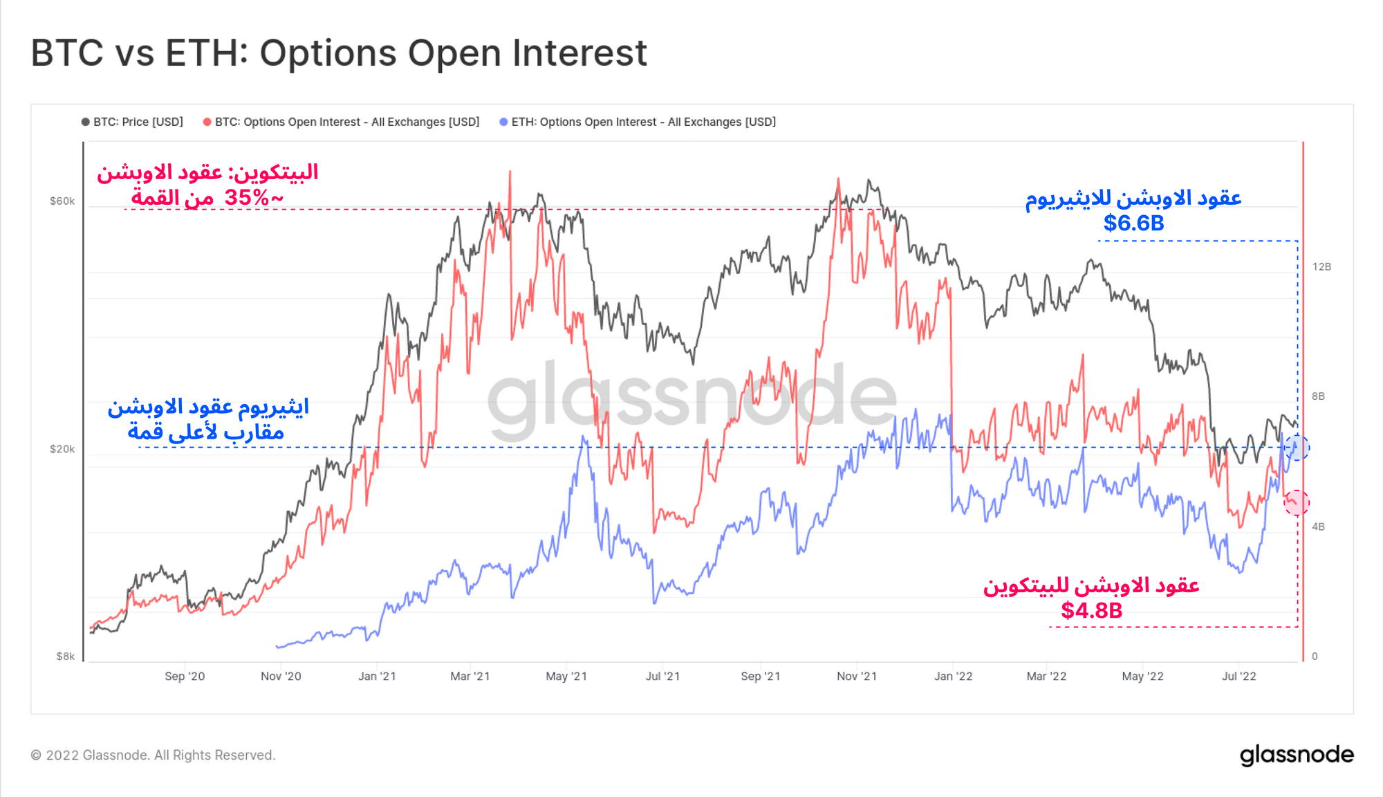 على الرغم من أنها ليست أعلى مستوياتها على الإطلاق حتى الآن ، فإن العقود المفتوحة للخيارات للايثيريوم يقترب من ان يكون الأعلى تاريخيا ، في حين أن العقود المفتوحة على البيتكوين لا تزال أقل بكثير من اعلى قمة وصلت لها عند 35 ٪ فقط من أعلى سعر للبيتكوين ATH.