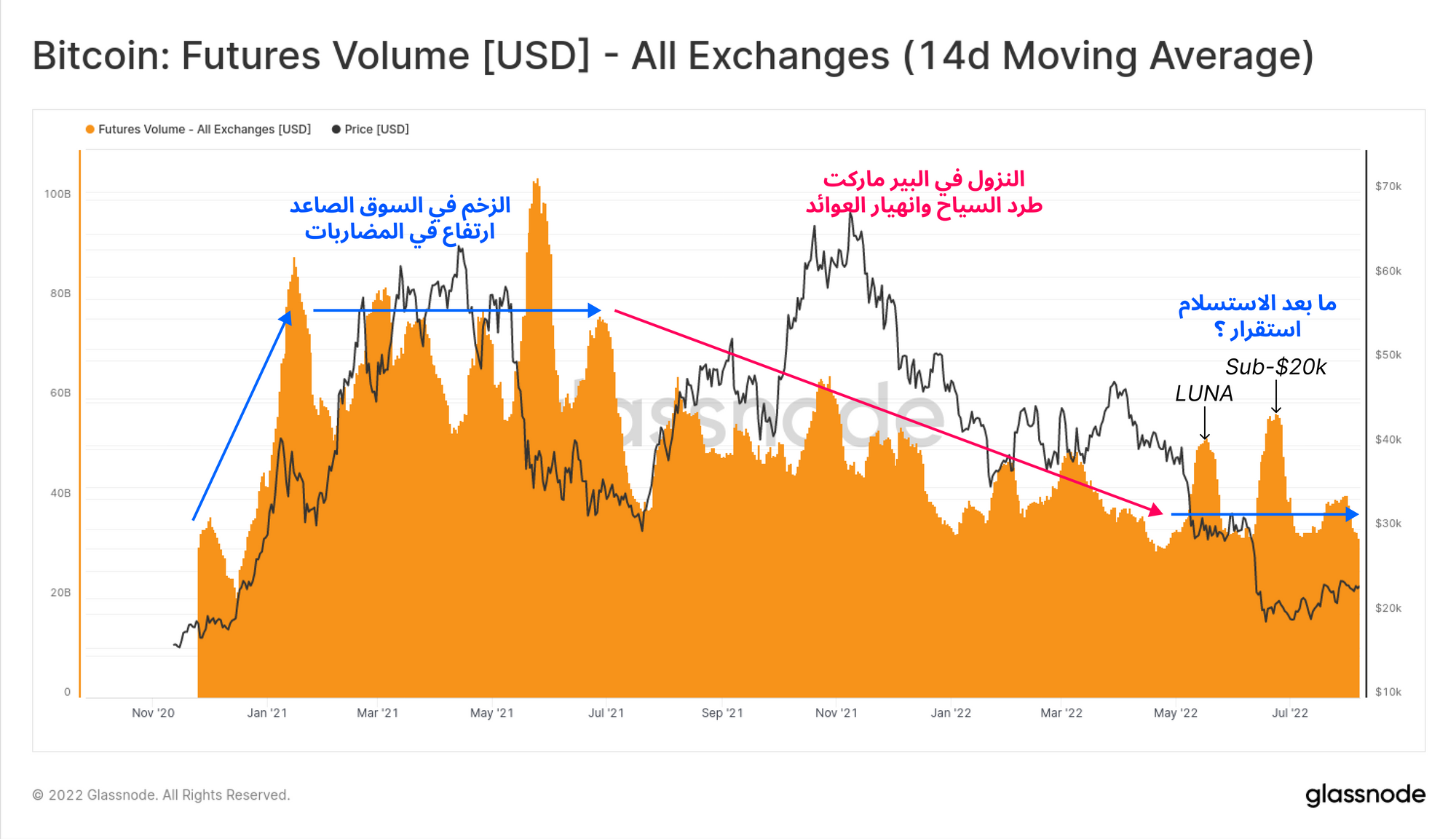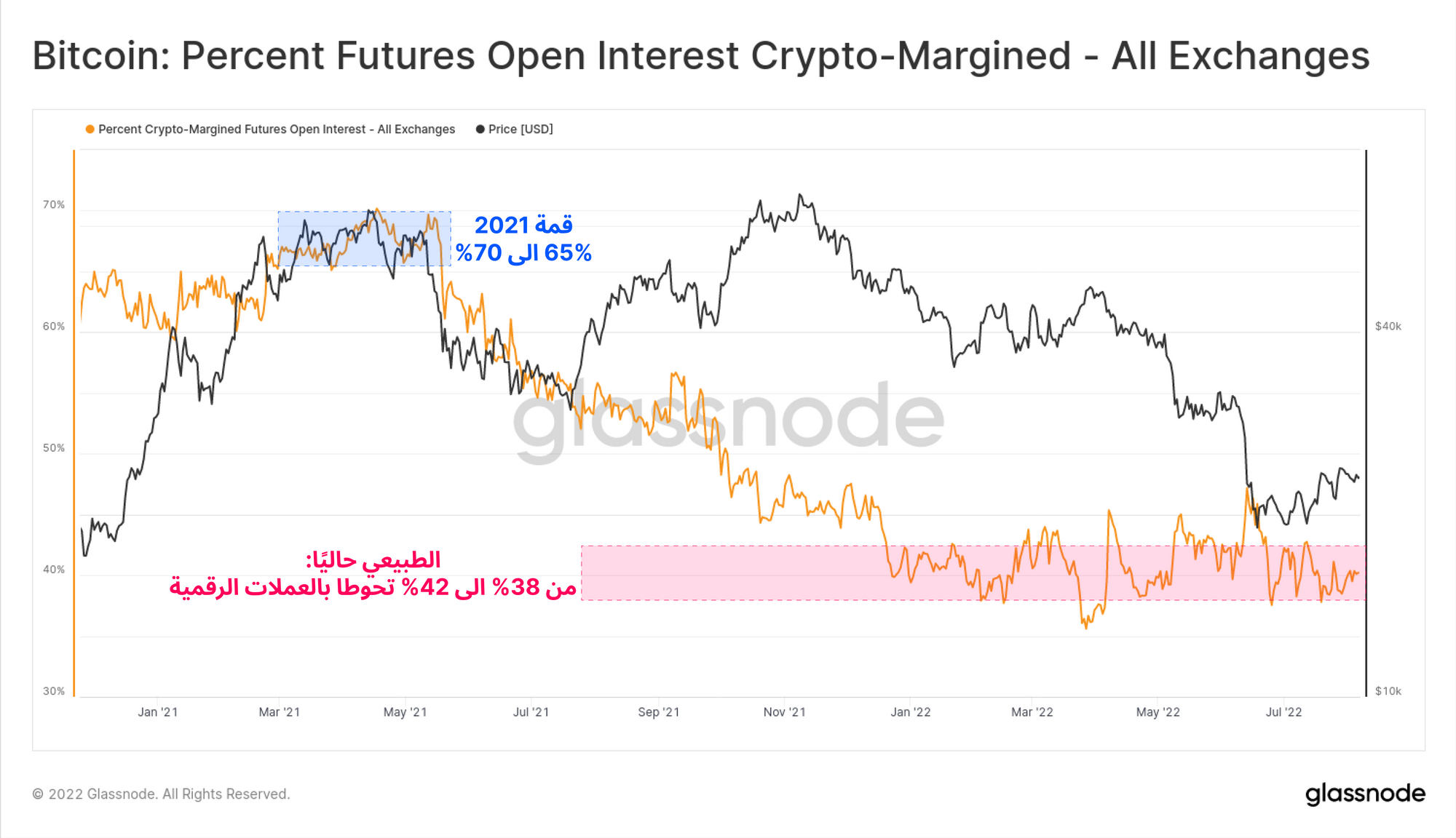 مقارنة حجم العقود المفتوحة OI بفئة BTC تساعدنا في عزل فترات الارتفاع في الرافعة المالية للفيوتشرز عن تغيرات أسعار العملات. لكن القياس بفئة الدولار الأمريكي، يبلغ حجم العقود المفتوحة الحالية 12.4$ مليار دولار، وهو مستوى منخفض نسبيًا، ويساوي حجم السوق الكلي في بول ماركت يناير 2021، و ايضاً يساوي أدنى مستويات سعر البيع عند 29$ ألف دولار في يونيو 2021.