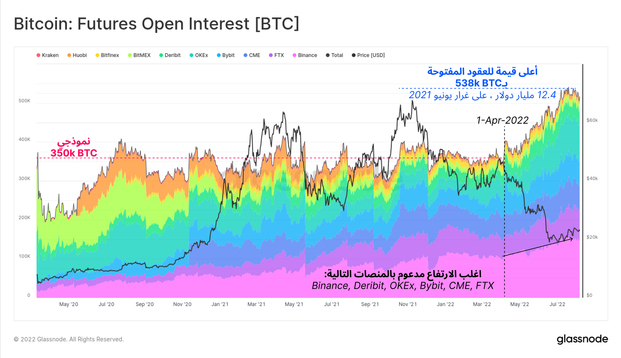 منذ بداية شهر أبريل ، شهدت أسواق الفيوتشرز للبيتكوين ارتفاع كبير في العقود المفتوحة OI، حيث ارتفعت عن خط الأساس البالغ حوالي 350 ألف بيتكوين، ووصلت إلى مستويات عالية جديدة تبلغ 538 ألف بيتكوين. و يقود هذا النمو عدد قليل من منصات التداول، ابرزها Binance و Deribit و OKEx و Bybit و FTX و CME.