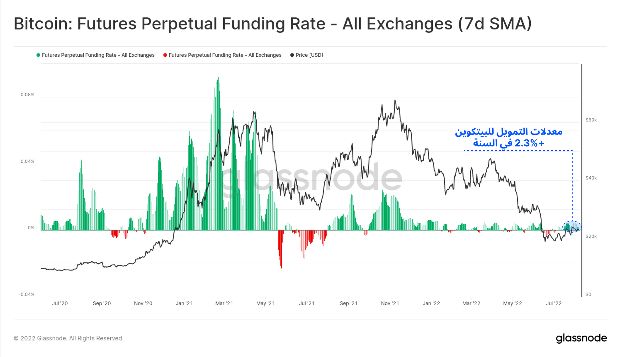 🔔 فكرة تنبيه: معدل التمويل (متوسط ٧ ايام 7D SMA) التي تكسر تحت الصفر من شأنها أن تشير إلى انعكاس سلبي للعلاوة الحالية ، والاختراق فوق 0.005٪ من شأنه أن يشير إلى زيادة رسوم المضاربة.