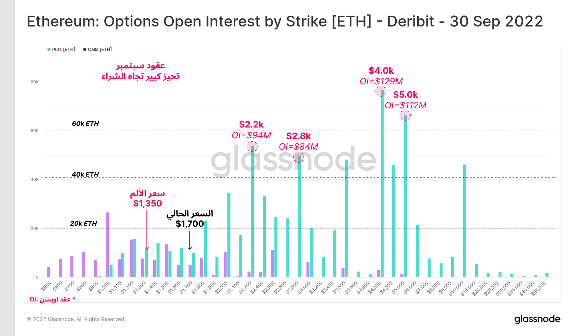 إذا نظرنا إلى عقود سبتمبر على منصة Deribit ، فإن التحيز الاتجاهي لمتداولي الايثيريوم واضح . خيارات الشراء في الاوبشن اكبر بكثير من خيارات البيع حجما ، حيث يراهن المتداولون على أسعار الايثيريوم التي تزيد عن 2.2 ألف دولار ، مع عقود مفتوحة كبيرة يصل توقع السعر إلى 5.0 آلاف دولار.