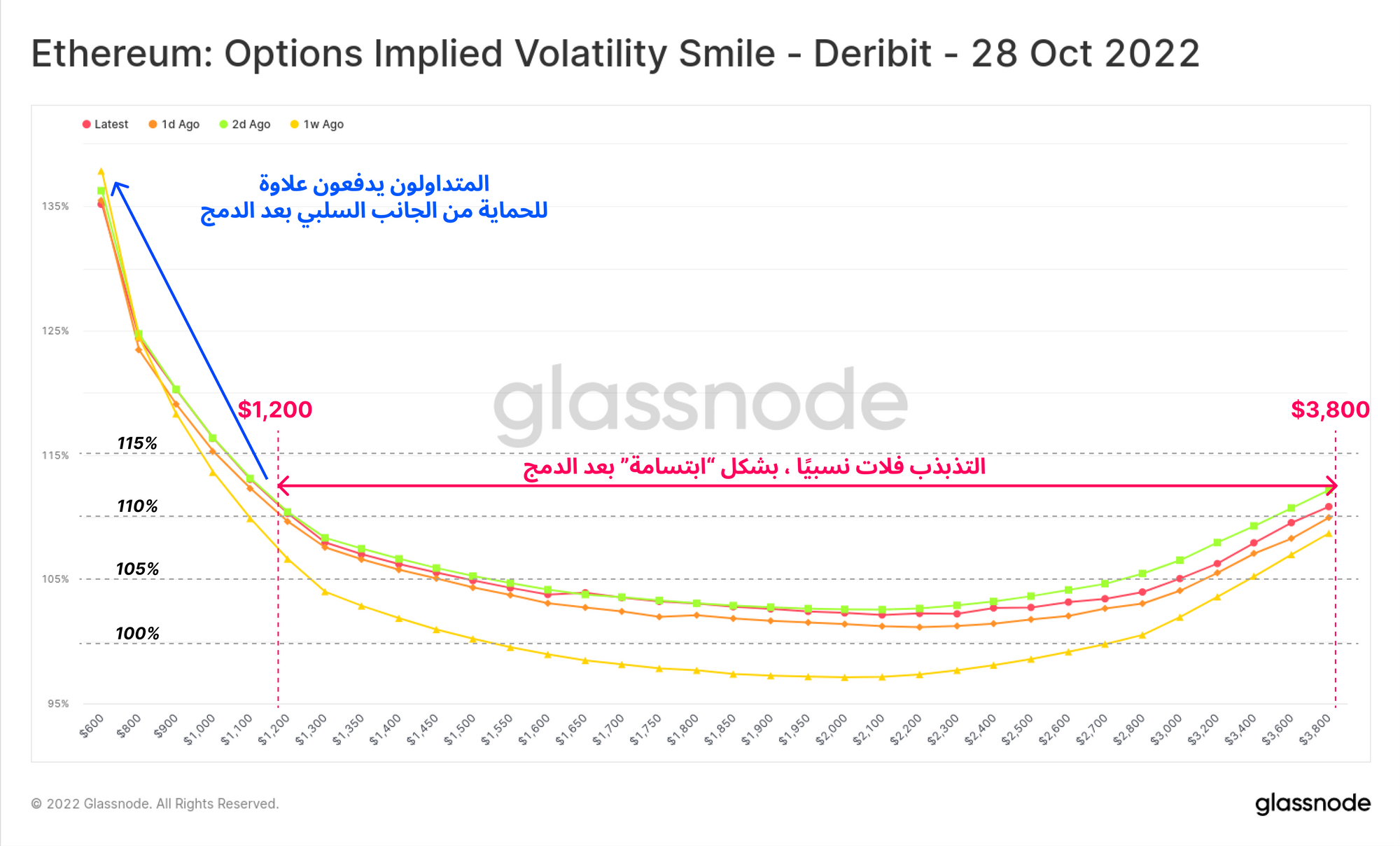 إذا قارنا شكل وحجم تذبذب الإيثيريوم من سبتمبر إلى أكتوبر نستطيع بأن نلاحظ النزول في الذيل الأيمن لل Curve ويشير ذلك إلى إنخفاض الطلب نسبيا على إيثيريوم في عقود الخيارات بعد حدوث الدمج. ومن المثير للإهتمام بأنه بعد حدوث الدمج مما يشير بأن المتداولين يدفعون مقابل خيار البيع بعد الدمج وهنا المتداولين يطبقون مقبولة إشتر الإشاعه وبيع الخبر .