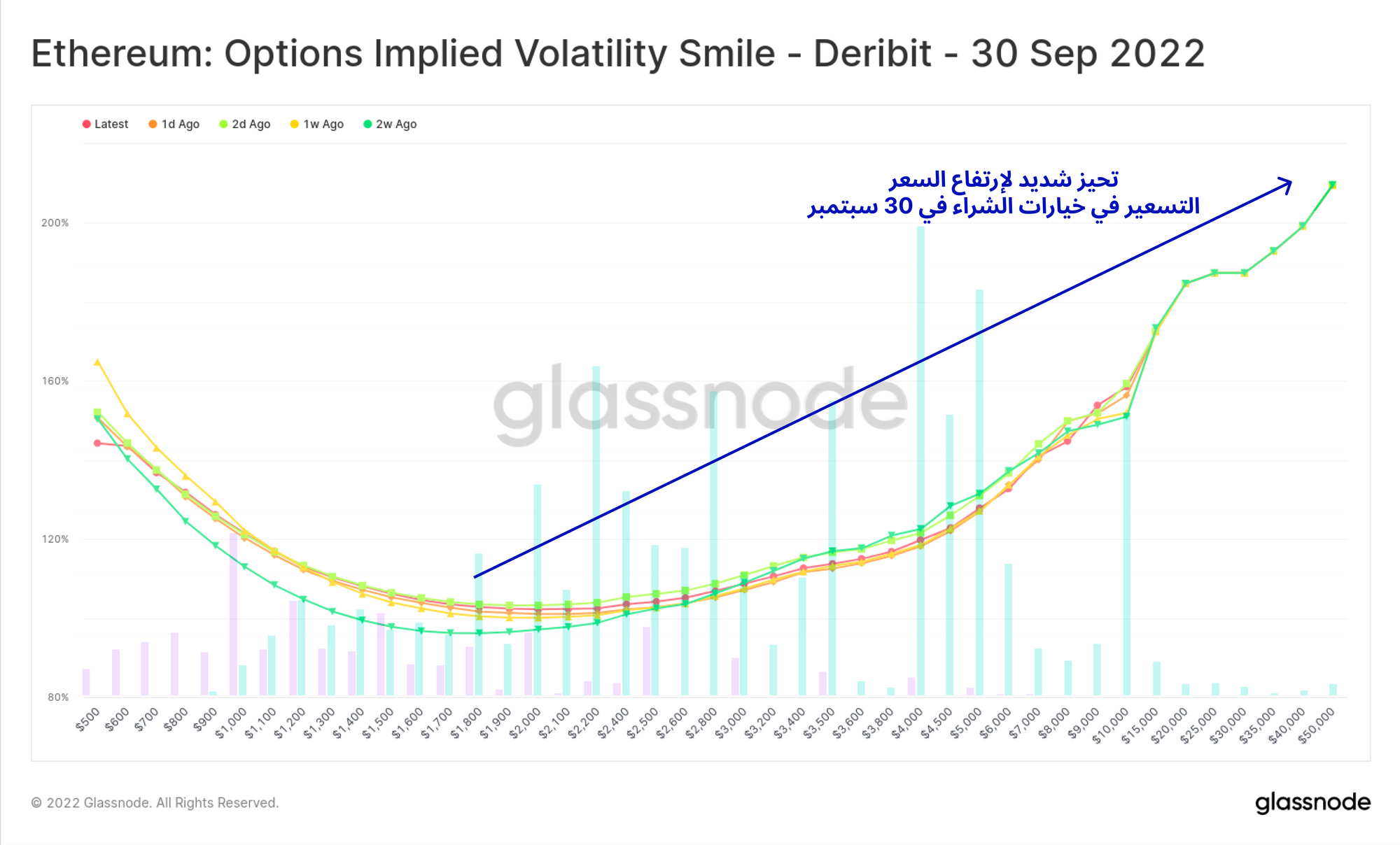 الطلب كبير من جانب الشراء في عقود الاوبشن ( اوامر شراء الايثيريوم ) التي تنتهي في سبتمبر إلى حالة من التحيز تجاه الصعود الشديد. يوضح هذا الرسم البياني أشرطة العقود المفتوحة ، حيث يمكن ملاحظة أن الميل الصعودي يشير إلى استعداد متداولين عقود الشراء ( رهان على صعود السعر ) في دفع الرسوم/علاوة.
