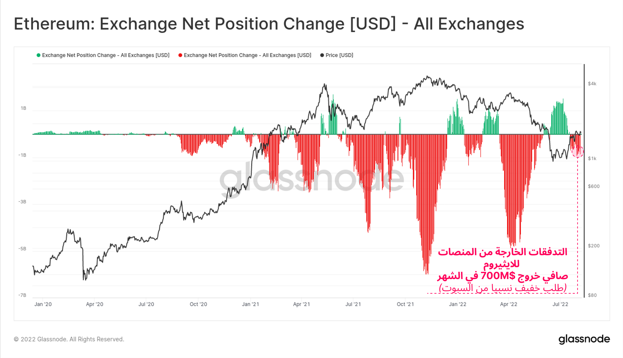 بالنظر إلي التحيز الصعودي في سوق خيارات الإيثيريوم فمن المتوقع أن يكون الطلب الفوري (Spot) قوي جدا ولكن بالنظر لإحتياطي المنصات نجد بأن قيمة السحب الشهري تقدر ب 700 مليون دولار أمريكي . في حين مبلغ 700 مليون دولار هو مبلغ كبير فإن عمليات السحب من الصرف تبدو باهته مقارنة ب قمم الإيثيريوم الأخيرة التي بلغت 3 مليار دولار شهريا وكذلك مقارنه مع 6,6 مليار دولار في الفائده المفتوحة للخيارات ولكن السحوبات الشهرية اليوم تقدر ب 2% من حجم تداولات سوق المشتقات . حينما النسبة وصلت إلي 20% في شهر أبريل 2020 وشهر نوفمبر 2021 .
