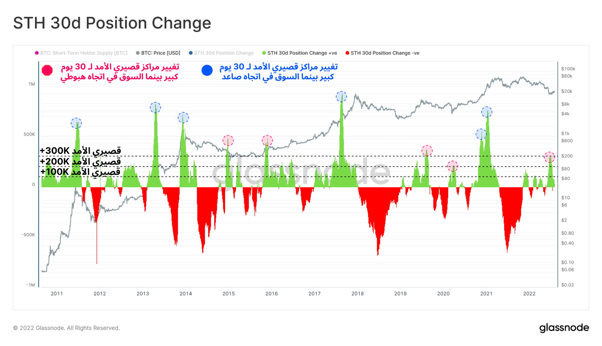 عادة ما يكون تراكم STH الشديد متزامنًا مع تشكيلات السوق الصاعدة (الموضحة في 🔵) ، ومع ذلك ، تبرز بعض أمثلة السوق الهابطة ضد هذا الاتجاه (ملحوظ في 🔴):