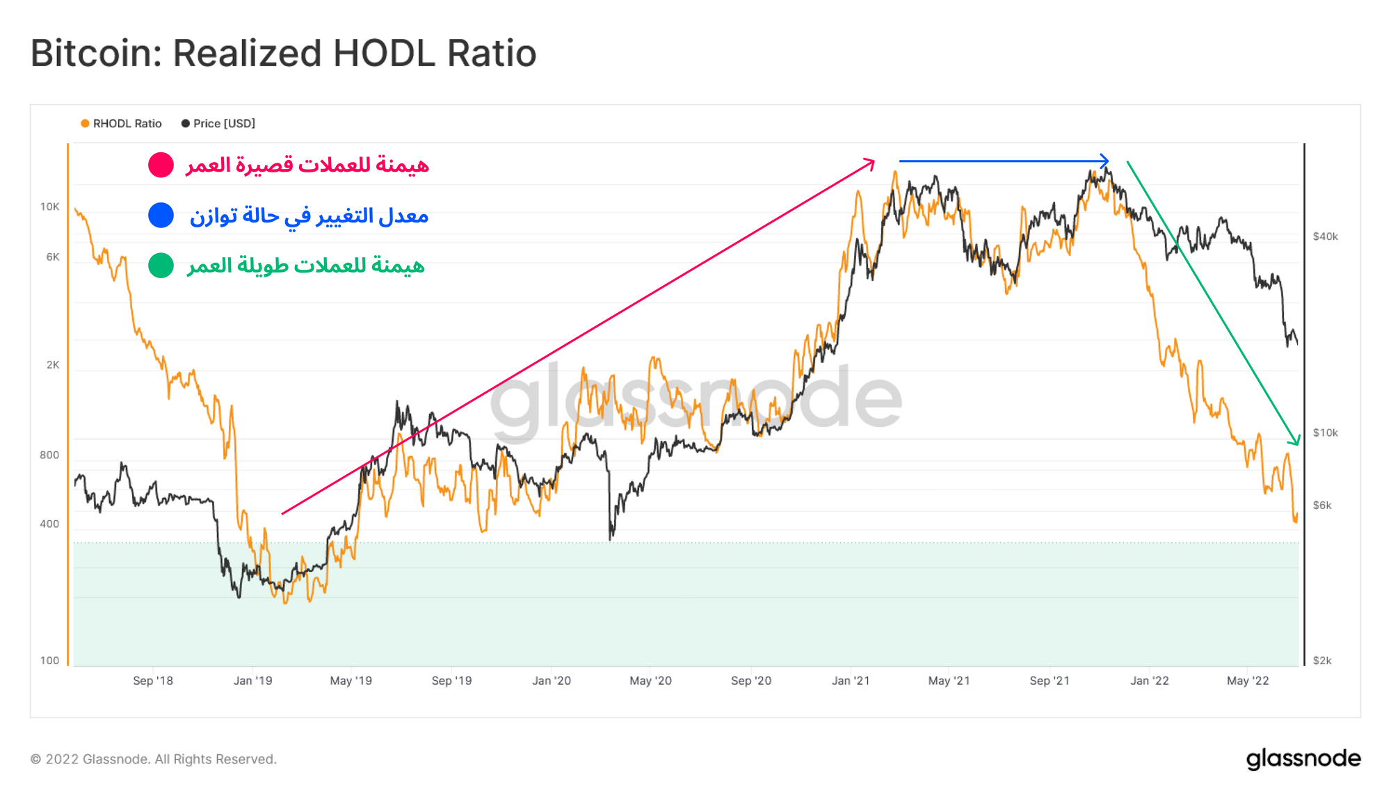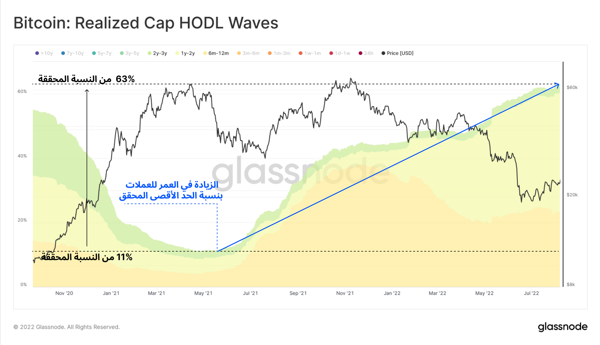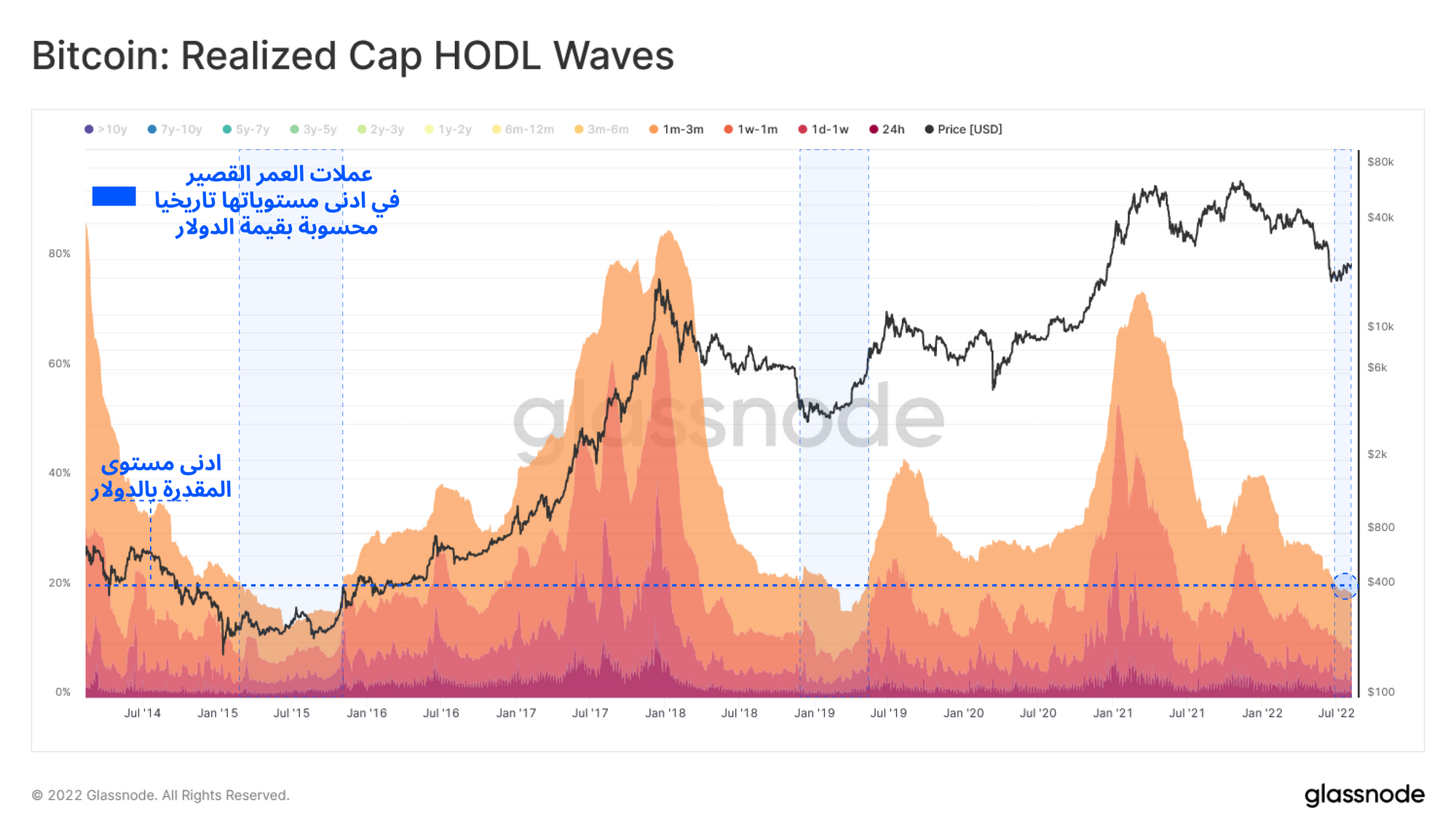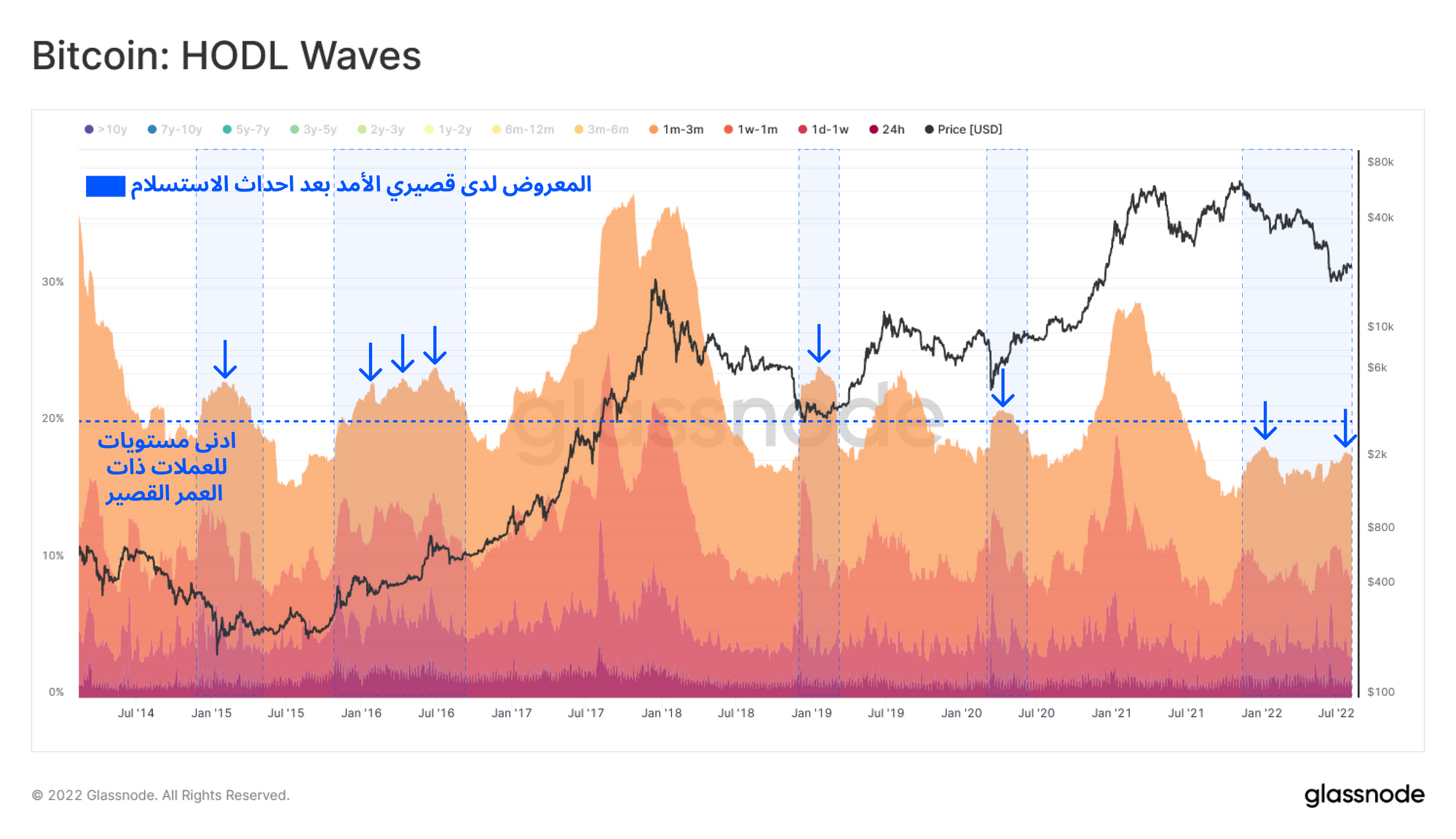 يمكن ملاحظة هذه الظاهرة بشكل أكبر عن طريق عزل عملات البتكوين من مستويات موجات الإحتفاظ ال HODLE WAVES التي تتراوح من ٦ أشهر إلي ٣ سنوات . توفر موجات المؤمنين بالبتكوين ال HODLERS نظرة ثاقبة عدد البتكوين المحتفظ به لمدة لا تقل عن الحد الأدنى ال 6 أشهر. وذلك يساعدنا في تحليل المشترين للبتكوين في دورة السوق لسنة 2022 وأغلب المشترين في هذه السنة يواجهون السوق الهابط لإول مره " البير ماركت" .