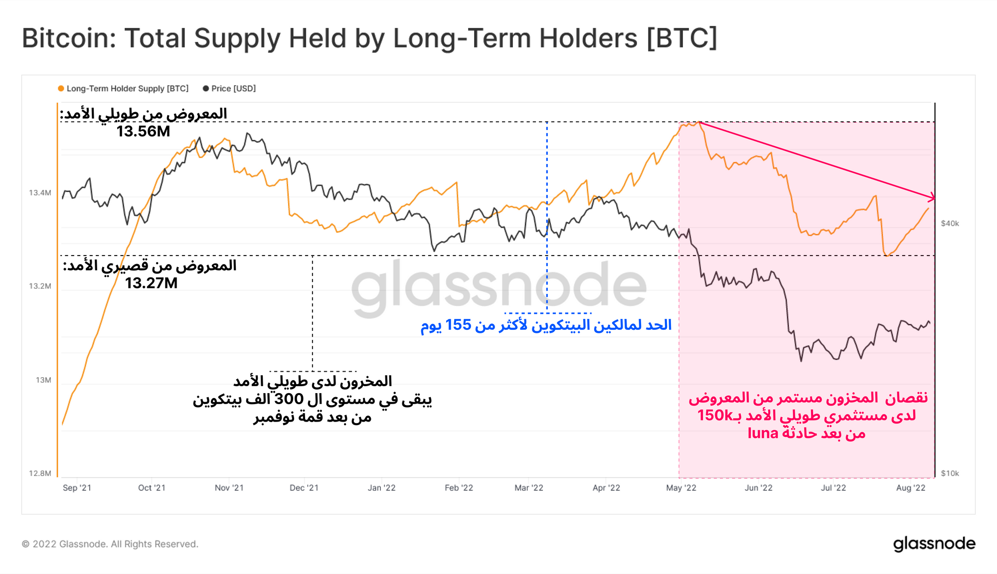 - كان العرض من ( LTH ) مقيّدًا بنطاق يتراوح بين 13.56 مليونًا و 13.27 مليون بيتكوين منذ قمة نوفمبر 2021 ATH ، وانخفض بمقدار 300 ألف بيتكوين فقط.