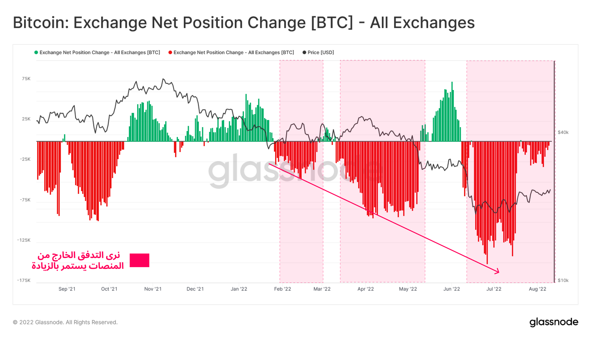 بشكل عام ، شهدت التدفقات الخارجة والداخلة للمنصات بصافي تدفق خارج( -100 ألف بيتكوين) في أعقاب الاستسلام البيعي بعد احداث LUNA في مايو 2022 ، والذي يمثل 3.2 ٪ من إجمالي التدفقات الخارجة منذ قمة (ATH ) مارس 2020.