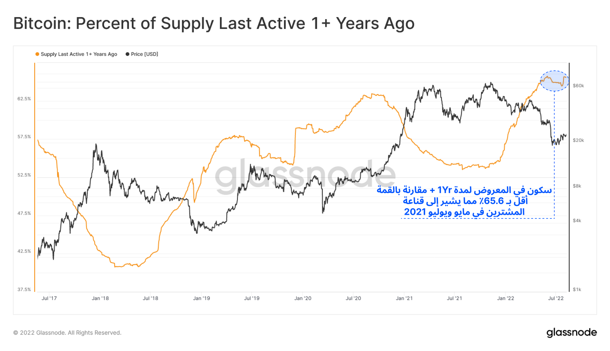 حاليا الكمية المعروضة من البتكوين الذي عمره سنة وأكثر مستقره تحت أعلي قمة سابقة لها في شهر مايو 2022 بنسبة 65%. وذلك يسلط الضوء على قناعة المشترين في شهرين مايو وجون لسنة 2021 بعد هجرة المعدنين الكبيرة التي حدثت ذلك الوقت . يشير التوازن خلال الأشهر الثلاث الماضية إلي أن نضج العملات يتوازن مع الإنفاق " البيع" ومن الممكن إعتبار ذلك ميكانيكية بناء السوق الهابط " البيرماركت" .