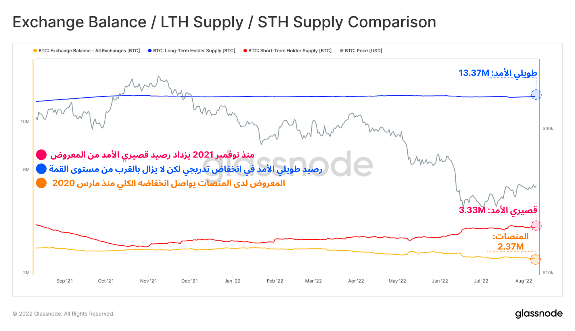من خلال مراقبة إجمالي العرض الذي تحتفظ به اصحاب الاستثمار طويلي يلة الأمد ، يمكننا تقديم ملاحظتين: