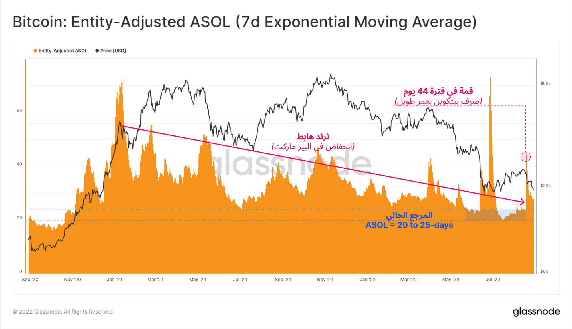ASOL تتبع متوسط العمر لكل إنتاج مستهلك، لكنها تتجاهل حجم العملة. لقد كان في انخفاض كلي منذ يناير 2021، بالتزامن مع الدب السائد. ارتفع ارتفاعًا خلال الأسابيع الأخيرة، حيث تم إنفاق مجموعة من العملات القديمة، ولكن هذا كان فقط للحظة عابرة.