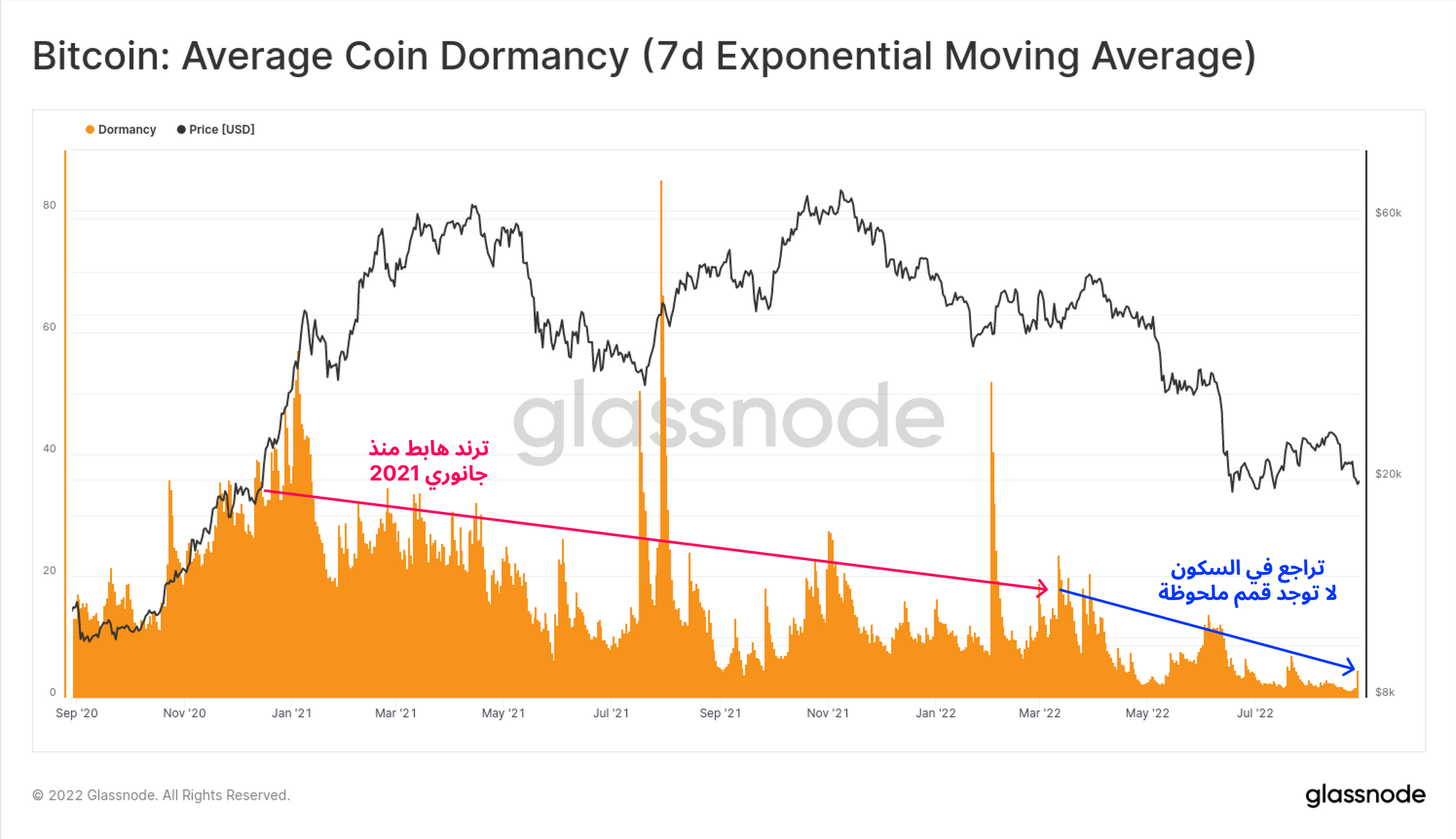 إذا كانت الأسعار ترتفع، فستكون هذه إشارة إيجابية، حيث تظهر أن العملات القديمة تظل نائمة. ومع ذلك، كما هو الحال، يشير هذا المؤشر  إلى أن ما يحدث هو العكس ، حيث لا تزال الأسعار تكافح من أجل الحفاظ على الخط حتى مع بقاء العملات القديمة في محافظ المستثمرين.