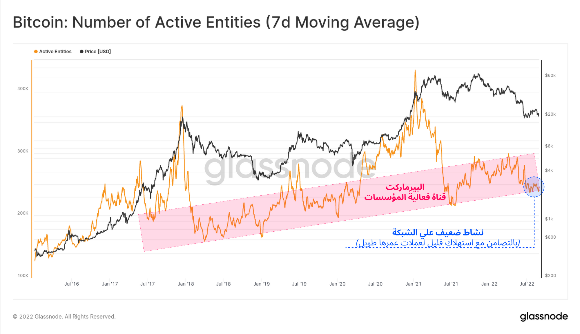 لا تزال سيكلوجية أنماط إنفاق المستثمرين ثابتة في منطقة السوق الهابط ويتم الخروج والبيع حينما يصل السعر لمستوى سعر التكلفة الأساسي للمستثمرين.  بالنظر إلى قاعدة المستخدمين النشطة حاليا نشاهدها بأنها منخفضة بشكل ملحوظ. وهنا نستطيع بأن نري بأن مستوى البتكوين على سعر 20 ألف دولار أمريكي يتم تحديثه بشكل ملحوظ ومستمر من ناحية سلوك المتداولين.