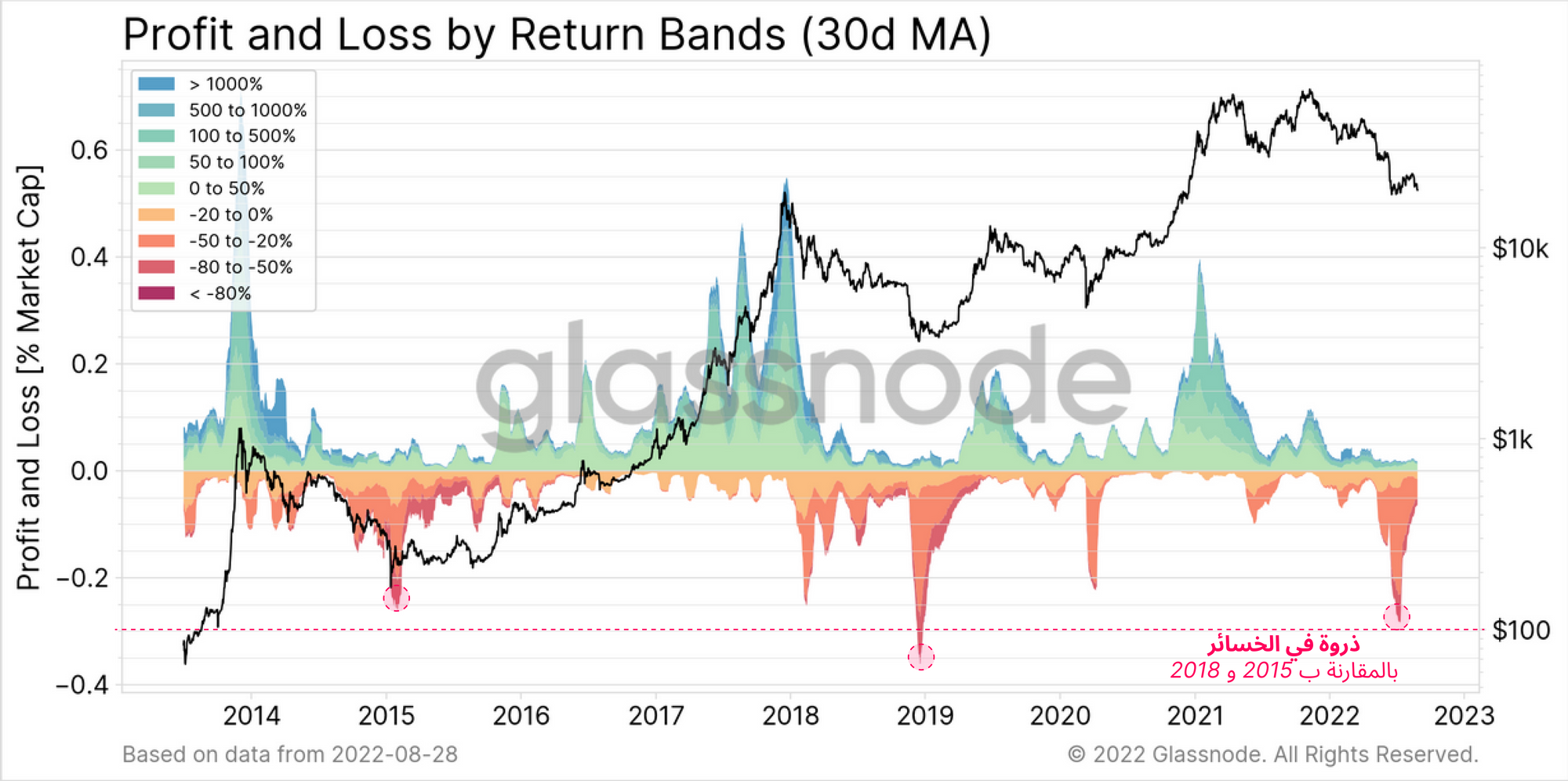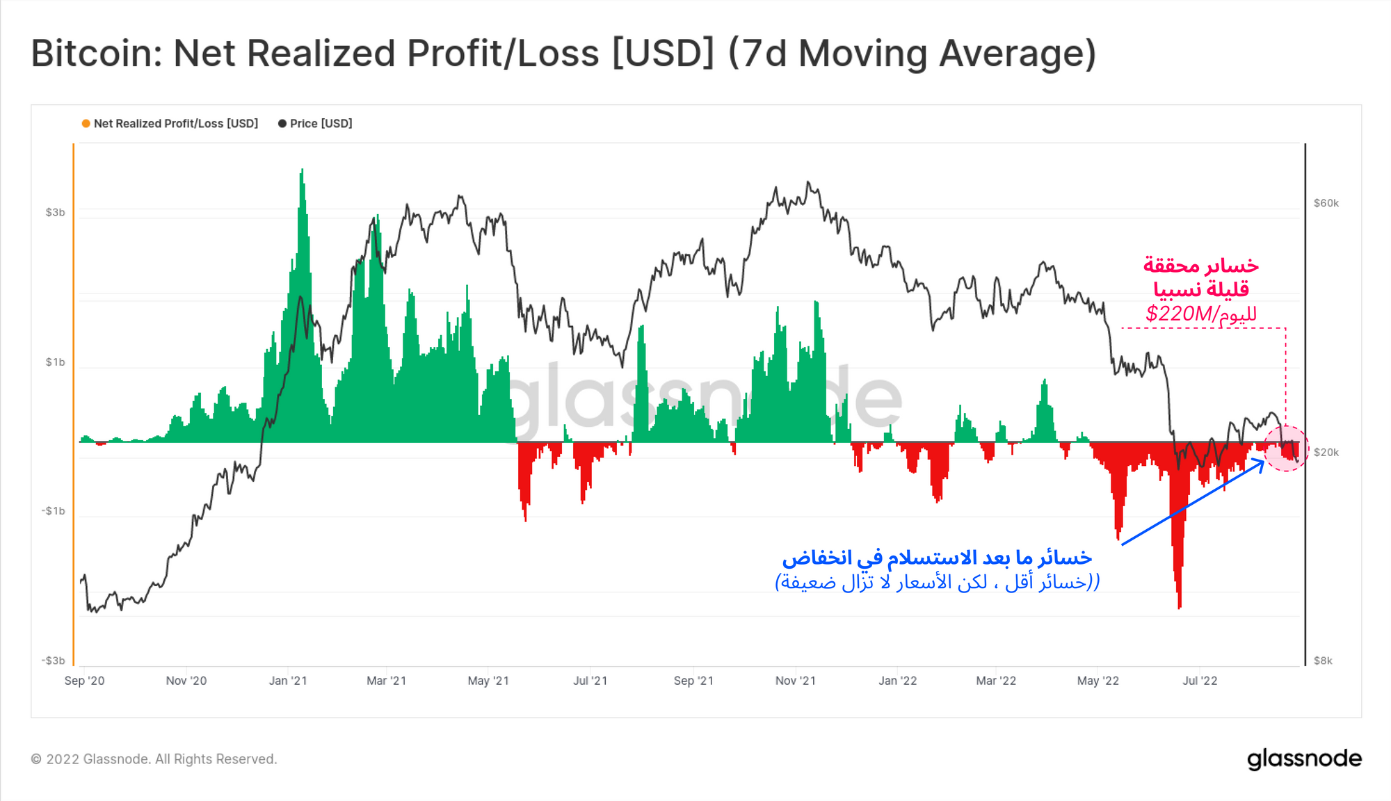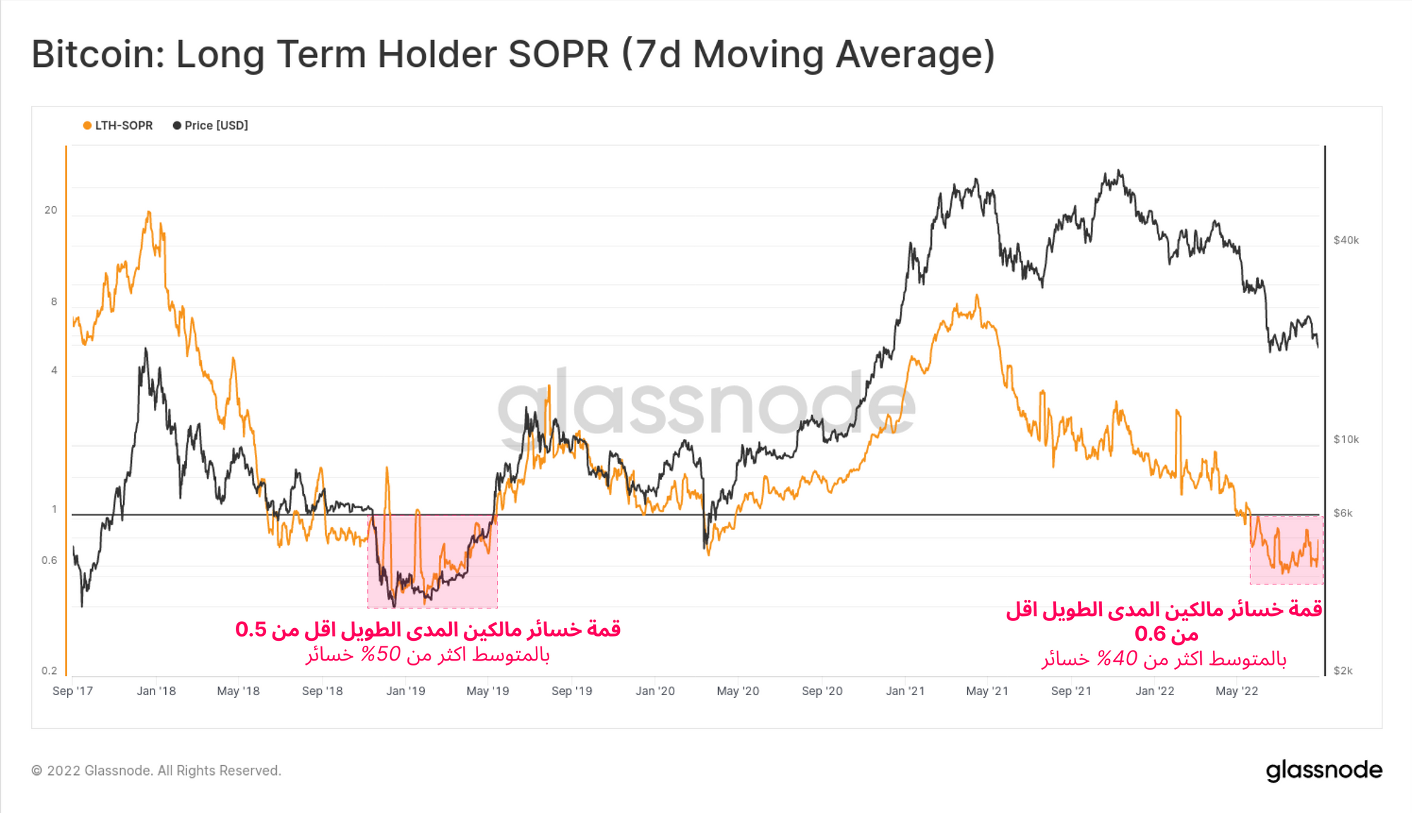 علي الرغم من أن نسبة الخسارة لم تصل إلى ذروتها وهي  50% مثلما شاهدنا في سنة 2018 لكن الضرر الذي يحدث في دورة هذا السوق ينافس نسبة الضرر التي حدثت في دورة السوق الهابط الماضي . ولكن لو حدث انتعاش لمؤشر ال ال LTH-SOPR وارتفعت قيمتها فوق ال  1 فقد تكون هذه إشارة إيجابية جيدة ولكن استغرق ذلك عدة شهور في الماضي للوصول إلي هذه القيمة.