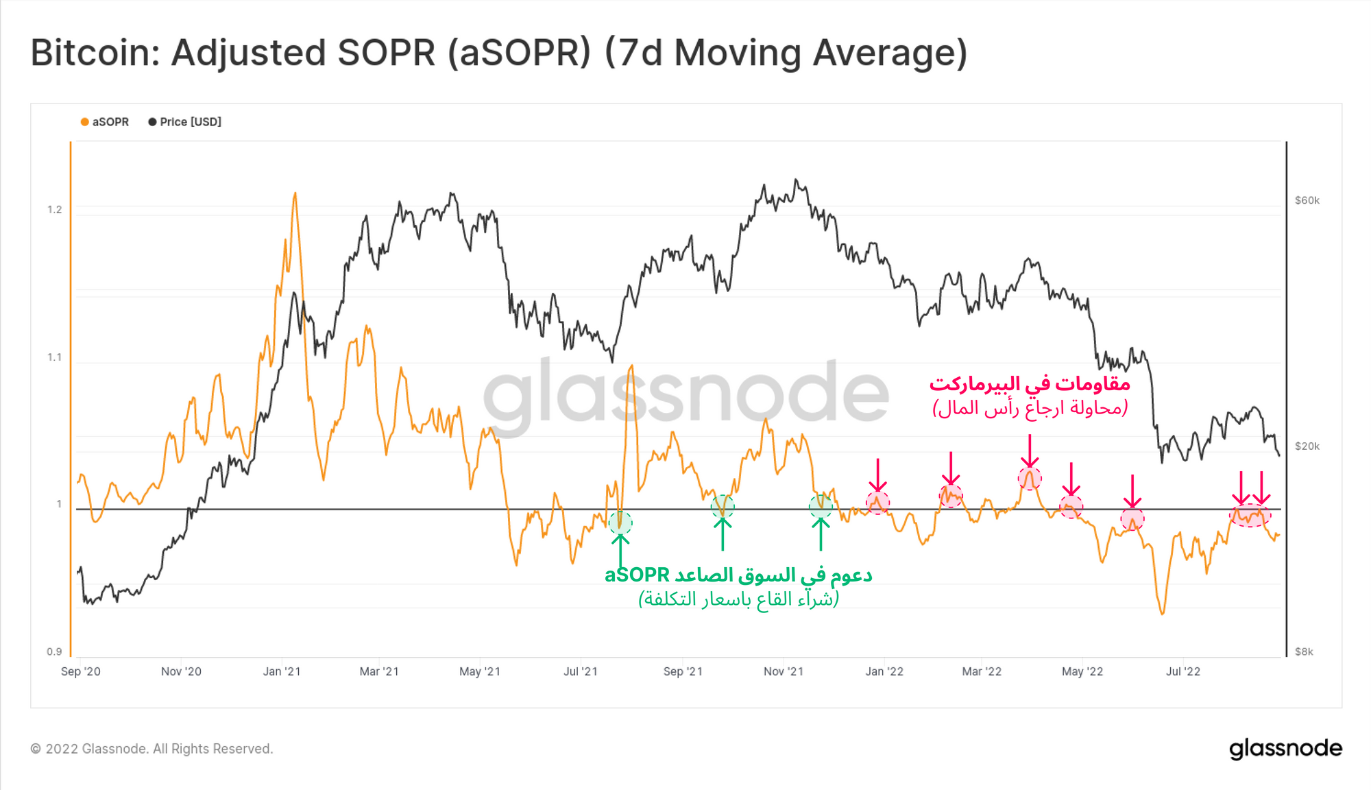 حينما ننظر إلي مؤشر ال  aSOPR يمكننا ملاحظة متوسط الربح أو الخسارة على عملات البتكوين التي يتم بيعها بشكل عام كلما أقتربت القيمة من  1,0 إزدادت أهمية قياس نسبة تعافي الطلب على العملات .