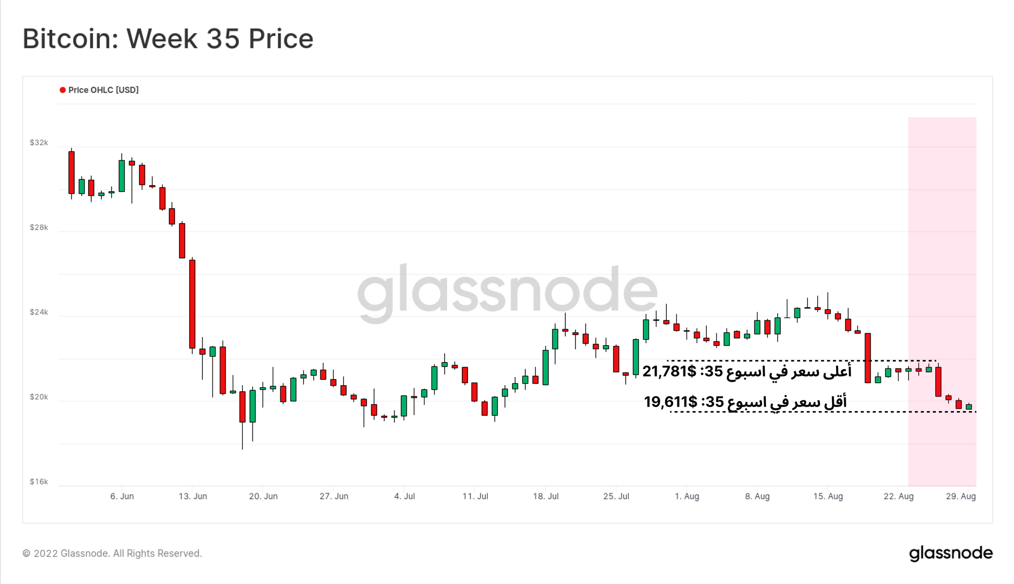 مع استمرار سياسة  الاحتياطي الفيدرالي الأمريكي وإعلانه إلى موقف متشدد من التضخم في جاكسون هول، رأينا ردة فعل سلبية للبتكوين ، كمؤشر لخروج السيولة العالمية، وفقًا لذلك. تم تداول الأسعار على انخفاض هذا الأسبوع، حيث تراجعت من  مستوى مرتفع بلغ 21781 دولارًا، وسجلت أدنى مستوى لها في عدة أسابيع عند 19611 دولارًا.
